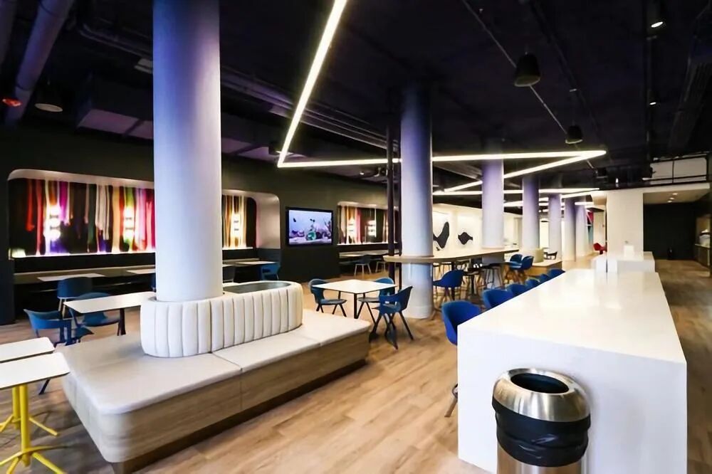 最令人惊艳的是位于楼层中央的咖啡区。这里的定制家具彻底打破了场景边界:看似普通的高脚桌其实是可拼接的舞台模块,拼接后瞬间形成15厘米高的表演台;靠墙的卡座沙发内置音响系统,而头顶的环形吊灯能根据不同场景切换灯光模式——白天是柔和的工作照明,傍晚开启"演出模式",配合墙面巨幕播放的热门演唱会片段,这里就变身成小型现场音乐场地。"已经有员工主动申请把团队例会放在这里开了。"人力资源总监笑着说。