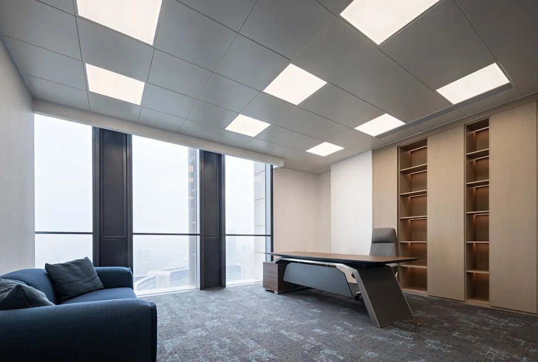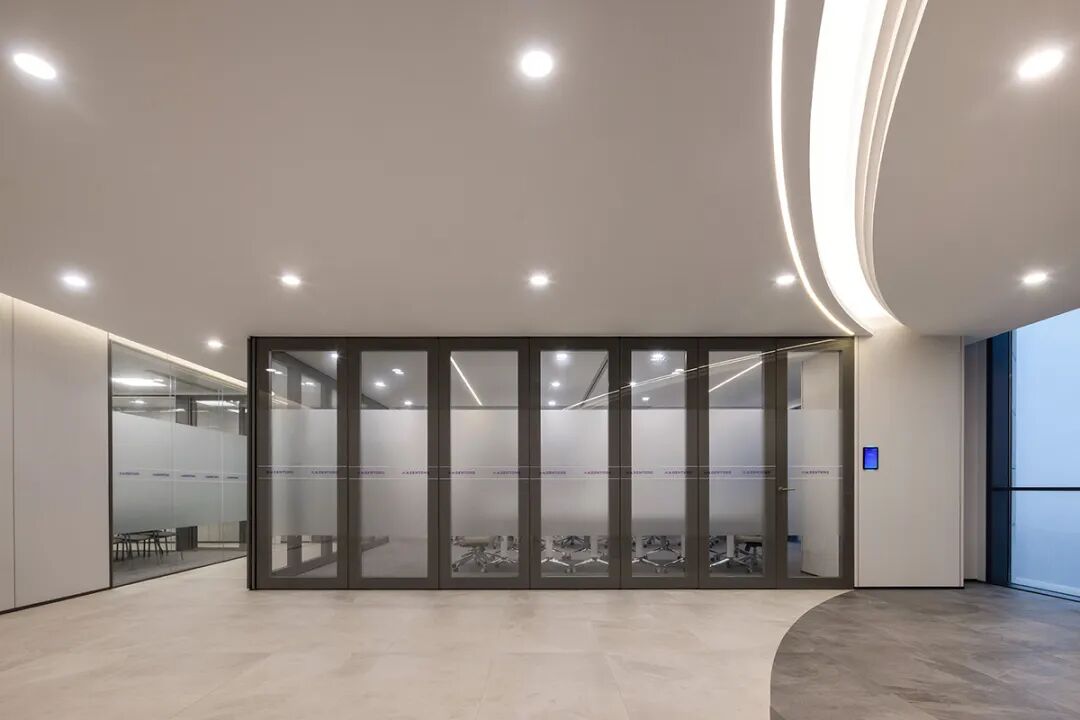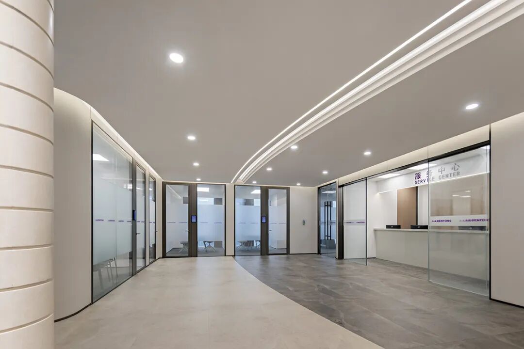 室内设计语言融合斯卡帕的曲折手法,以办公环境为载体,通过线性灯的蜿蜒排布与地脉曲线的延伸,隐喻律所对永续发展的坚守。天地相应的设计中,曲线造型模拟潺潺流水、层叠山脉与变幻云翼,立面采用天然石材,既寓意“浑然天成的顺势”,也以肌理质感隐喻中国文化中“坚如磐石”的信念;地面流淌的曲线则复刻自然山川的行走痕迹,使办公环境兼具自然意境与人文深度。