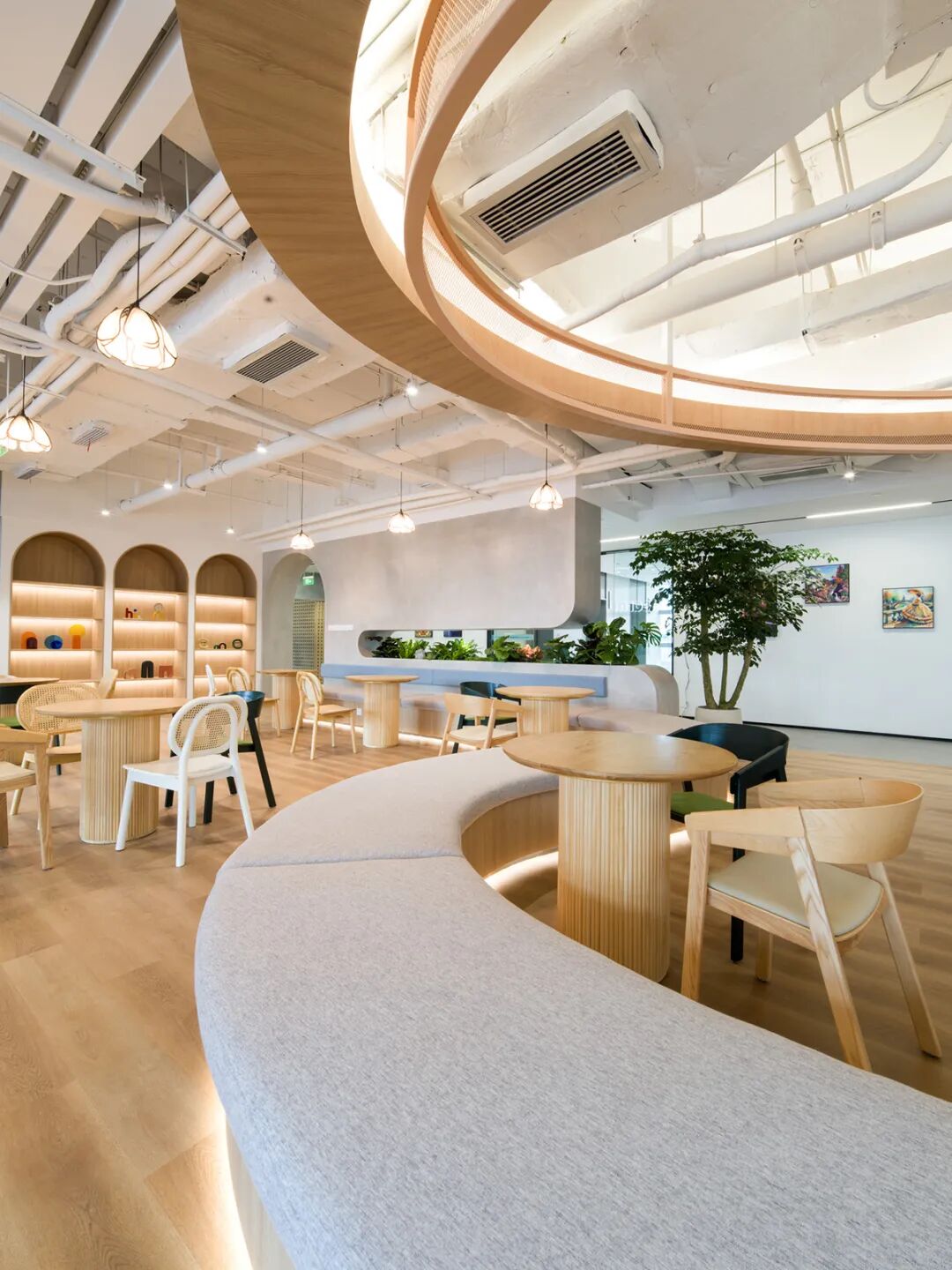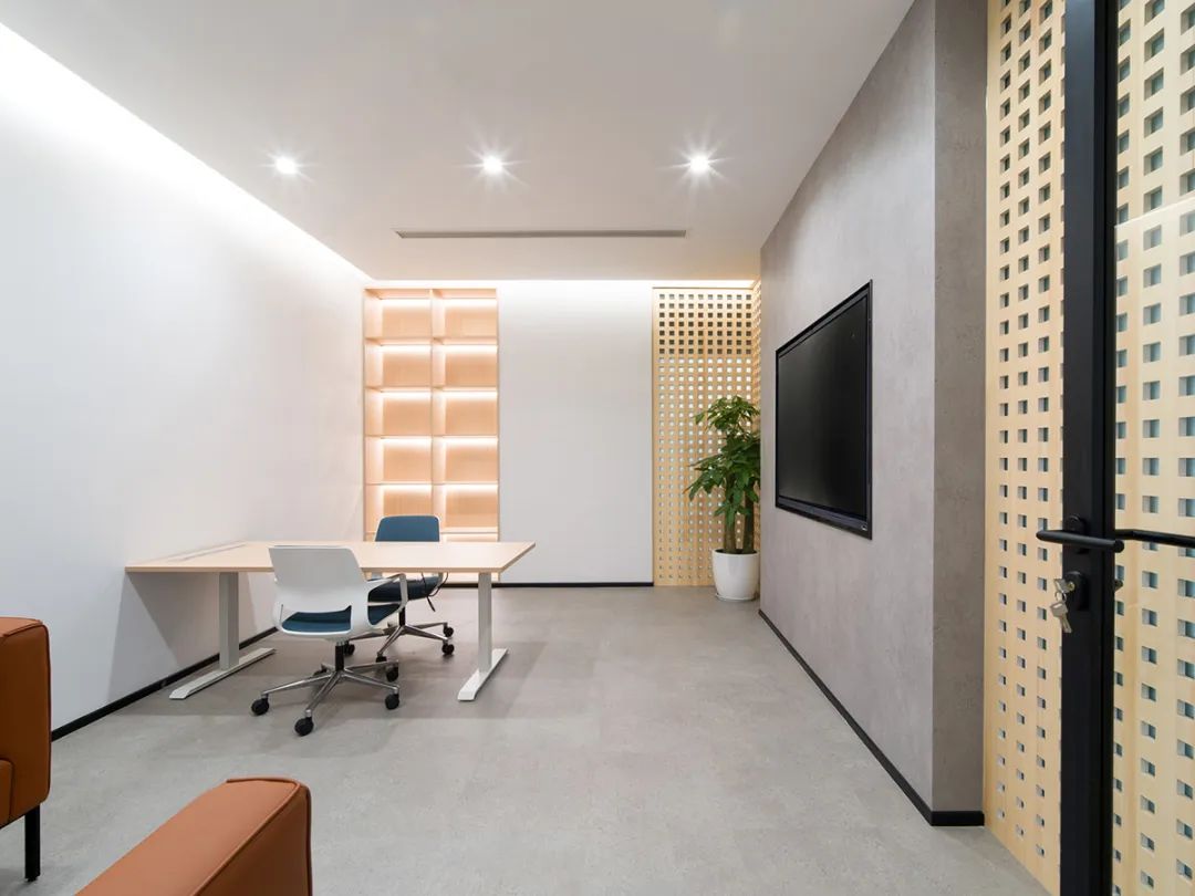 与此同时,设计师在整体空间设计规划中采用了主次分明的色彩策略。全遮光帘的运用不仅实现了光量调节,更在开合之间创造了丰富的光影变化。天然材质的办公桌、网皮面的办公椅与点缀其间的绿色植物形成了和谐统一,营造出素雅、简练的空间调性。这种设计不仅满足了功能需求,更兼顾了审美趣味,让员工在忙碌的工作中也能感受到内心的平静。
