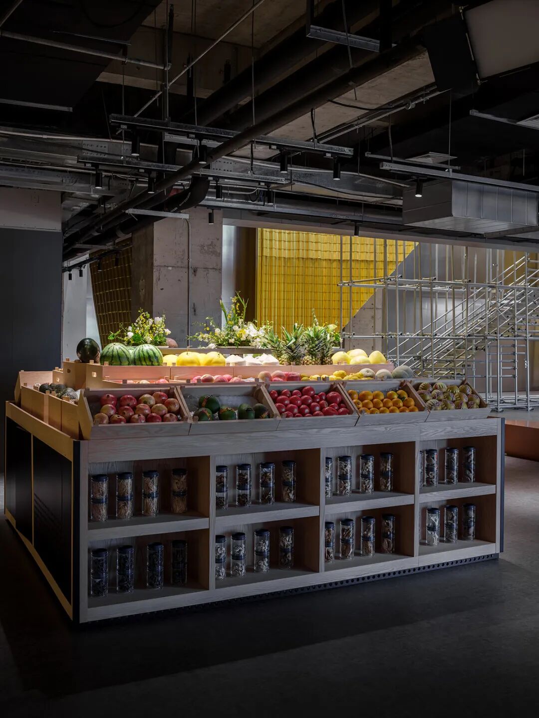 Physical virtual dual channel: A silver skeleton constructed from exposed scaffolding and galvanized steel plates, combined with a golden glazed tile array, forms a future Eastern visual symbol, achieving the translation of traditional pharmacy culture into the metaverse.