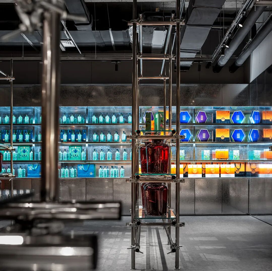 Eastern Futurism: The juxtaposition of palace wall elements and steel structures deconstructs the 349 year pharmaceutical history of Tongrentang into interactive digital assets, such as a virtual medicinal herb library in an infinite energy field.