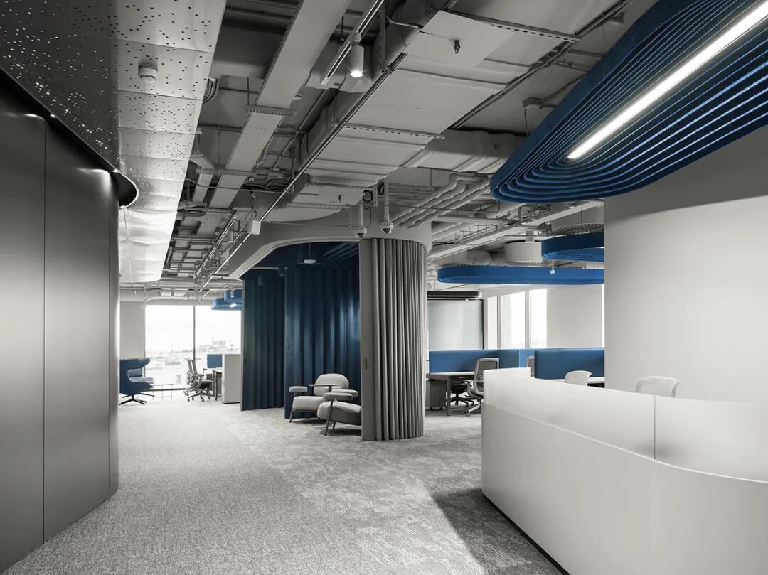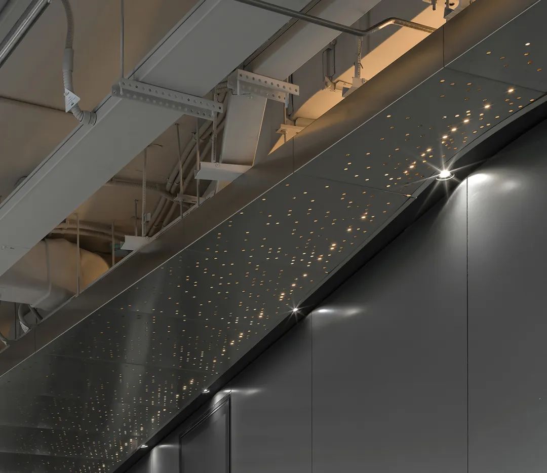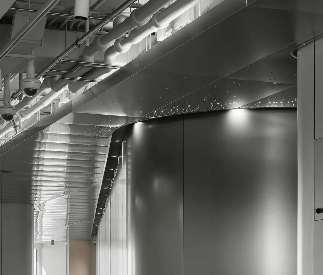 Entering this energy headquarters, the first thing that catches the eye is a large area of advanced gray tones, as if the deep background of the universe. However, this is not a monotonous grey world. The light passes through the multi-directional perforated structure of the metal ceiling and the nonlinear closed body block, achieving dynamic scattering in space, like sparkling light in interstellar space. This light and shadow design not only creates a strong sense of technology, but also fills the entire space with flowing vitality.