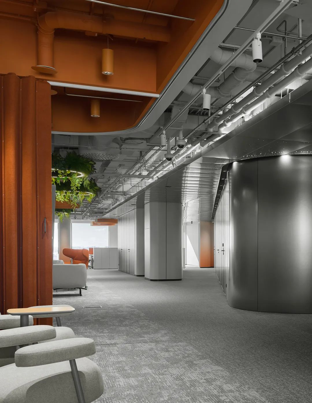 The vibrant organic open space contrasts sharply with the technological core area, yet is harmoniously unified. The use of warm tones, combined with wooden veneers and large areas of greenery, injects a warm atmosphere into this technologically advanced space. This design not only considers visual balance, but also takes into account the psychological needs of employees - in a high-tech work environment, one can still feel the warmth of nature.