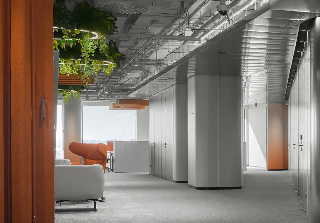 Keywords: office furniture, office environment design, energy, headquarters, concept of cosmic quasars, technological sense, organic openness, collaboration and focus, light and shadow, local bright colors, high-end gray, flexible and diverse, gradient colors, fashionable and diverse. The headquarters of the energy company is hidden in high-end gray, embodying the Moscow Interstellar Aesthetics