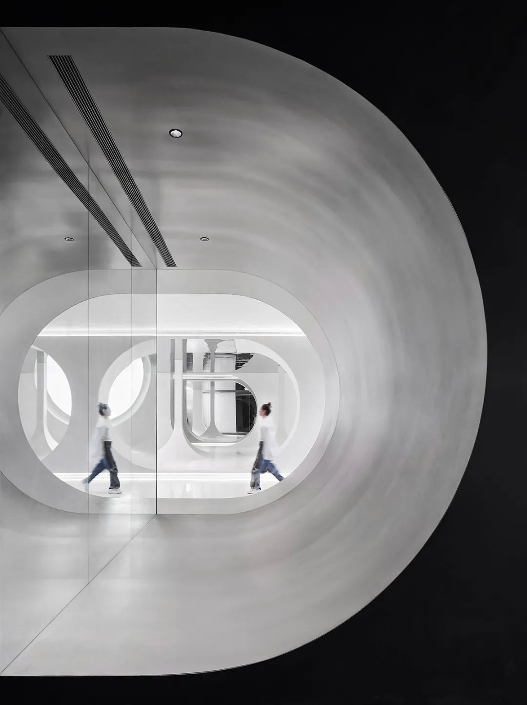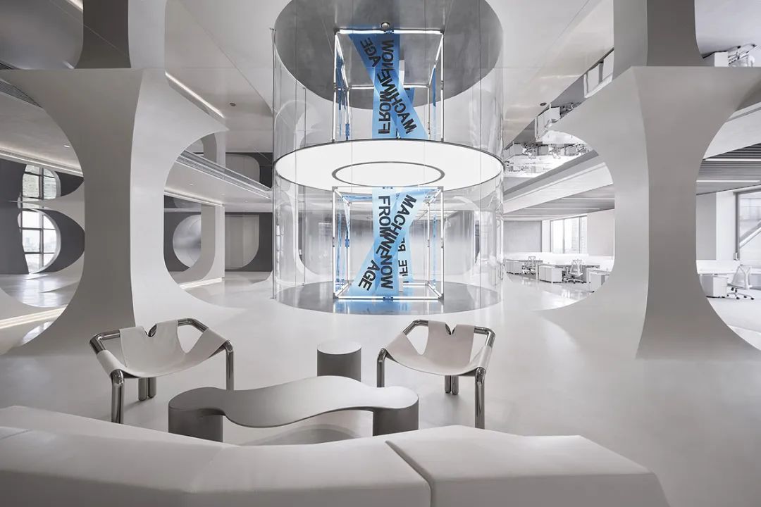 The embedded BOX display area is inspired by wormholes and extends the space through customized organic furniture installations. The core art installation adopts a square and square fusion design, with transparent materials melting the boundaries, combining the dual attributes of enterprise display and functional hub. The adjacent reception areas are connected by migratory lines, and the mirror stainless steel columns are transformed into a storage system, reflecting the neat aesthetics of customized furniture.