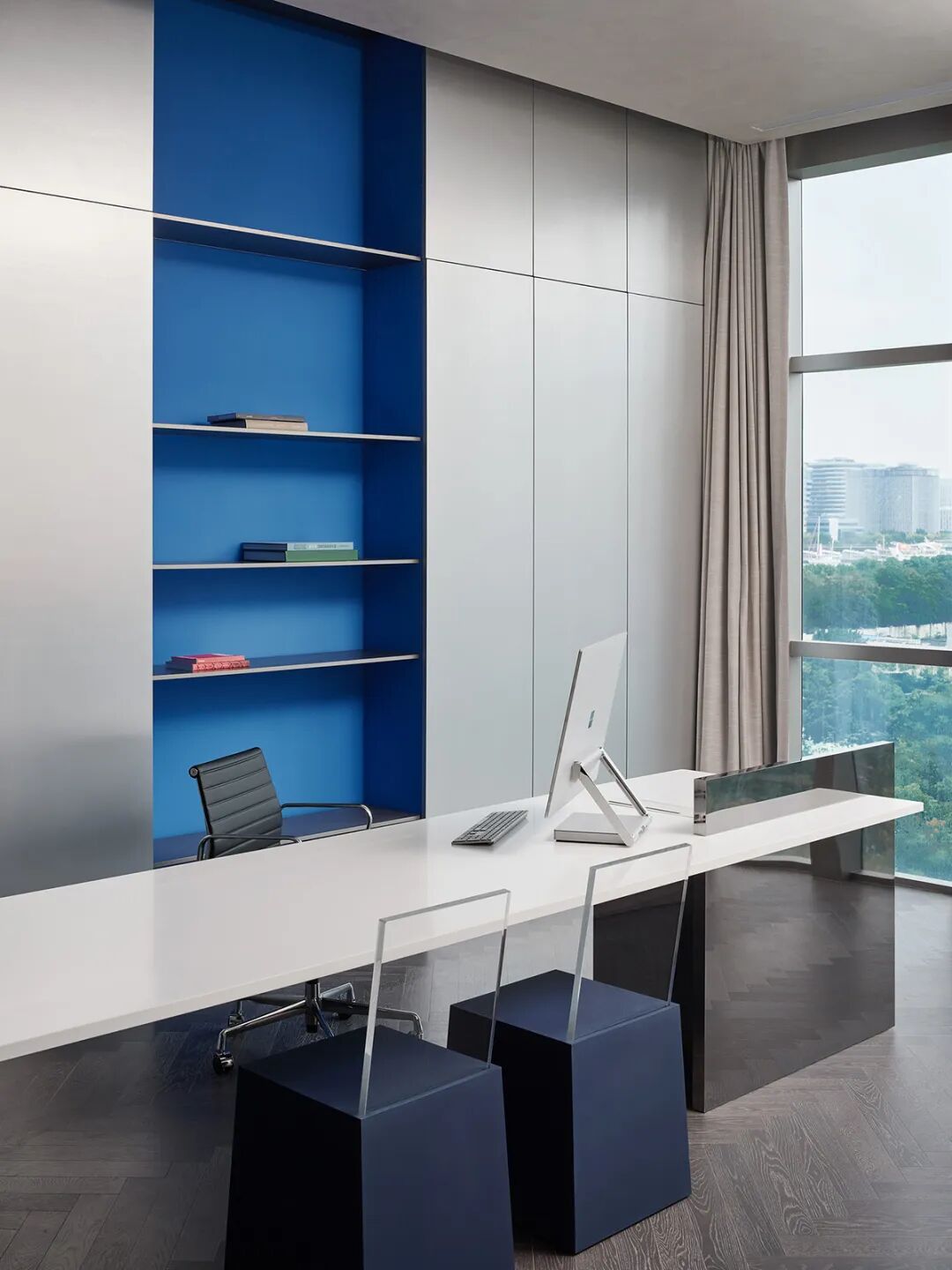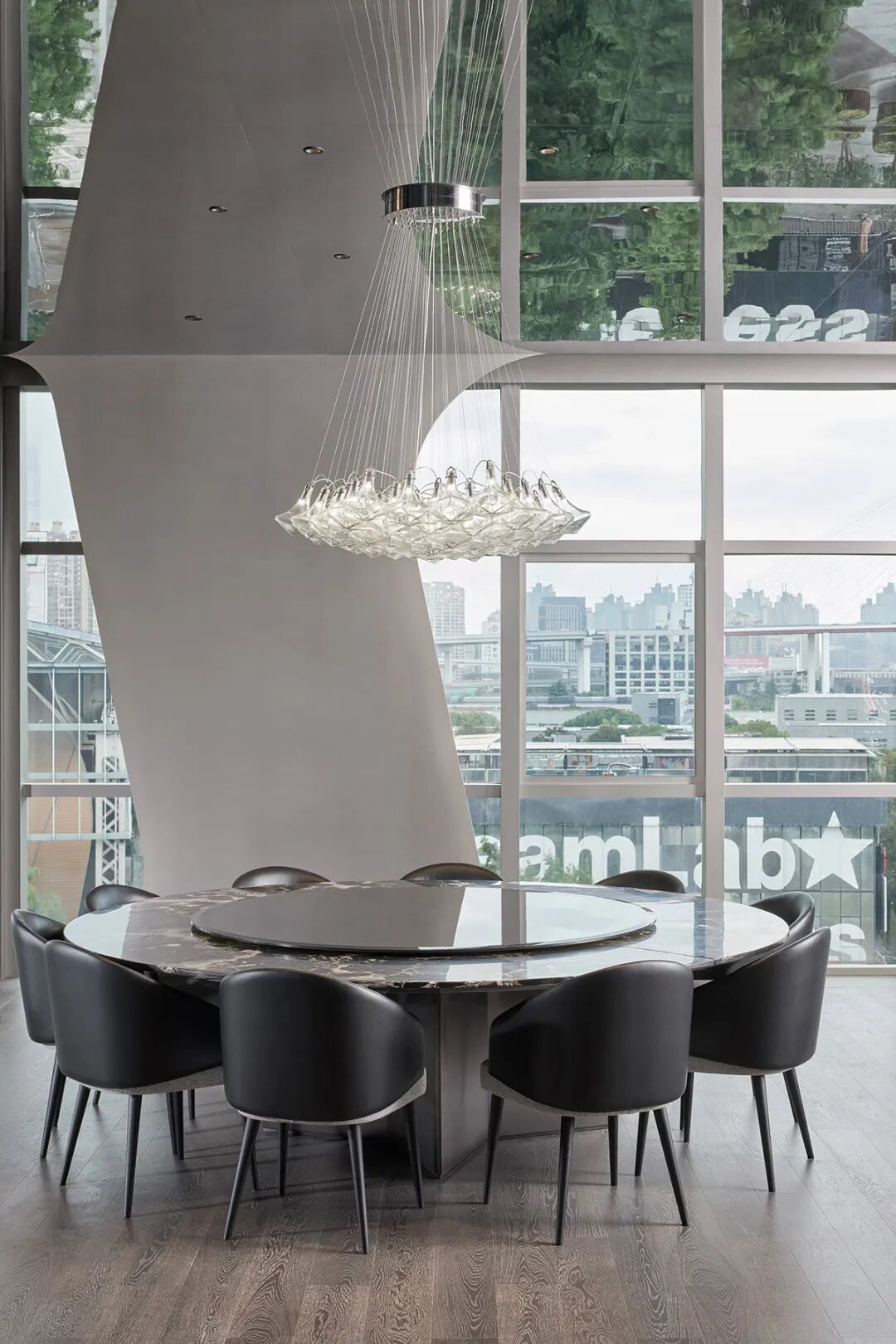 The open office area achieves internal and external penetration through floor to ceiling doors and windows, and the top of the dark grille forms a visual extension with the ground. The sunken conference room utilizes the original building structure, with columns wrapped in aluminum panels continuing the arc details, and the office furniture system forming a dialogue with the urban landscape of Lujiazui. The General Manager's Office interprets the emotional tension under the essence of simplicity through the refined lines of customized furniture.