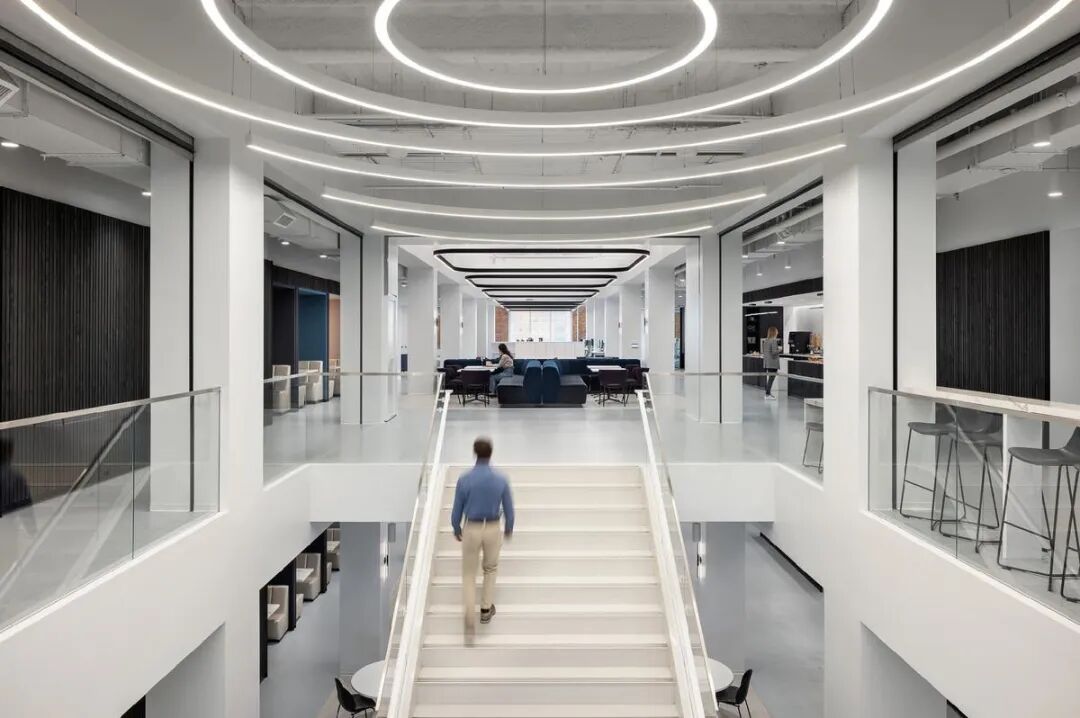 Dynamic spatial layout: The two floors are centered around a central staircase, forming a circular flow to ensure a clear view in both directions. The public area adopts a hotel style design, with coffee bars and rest areas set up opposite each other, supporting collaboration and communication of different scales.