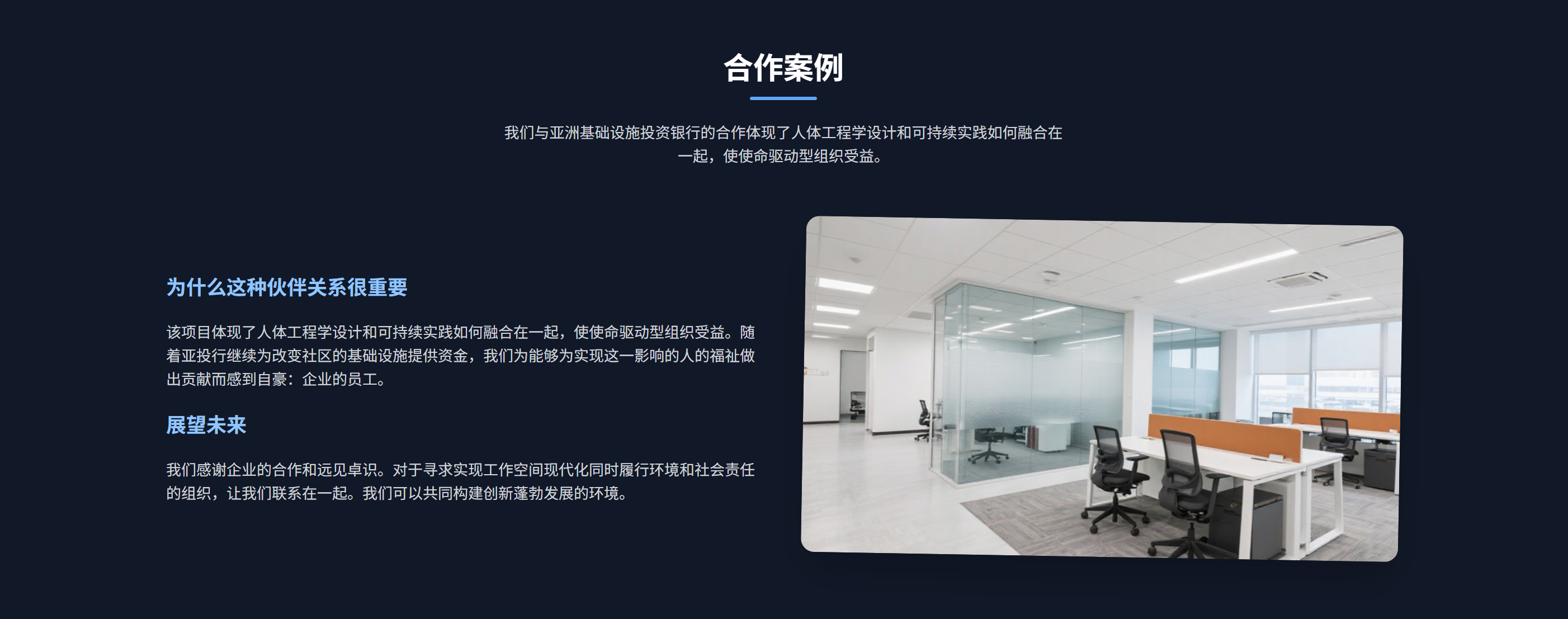 4️⃣ 无缝执行 从最初的咨询到安装,我们的团队确保对亚投行运营的干扰最小。严格的质量检查和安装后支持进一步巩固了对我们解决方案的信任。 为什么这种伙伴关系很重要 该项目体现了人体工程学设计和可持续实践如何融合在一起,使使命驱动型组织受益。随着亚投行继续为改变社区的基础设施提供资金,我们为能够为实现这一影响的人的福祉做出贡献而感到自豪:企业的员工。 展望未来 我们感谢企业的合作和远见卓识。对于寻求实现工作空间现代化同时履行环境和社会责任的组织,让我们联系在一起。我们可以共同构建创新蓬勃发展的环境。
