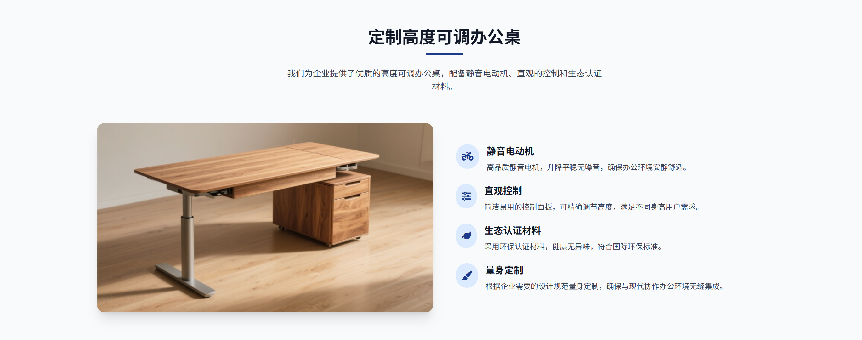 1️⃣ 定制高度可调办公桌 我们为企业提供了优质的高度可调办公桌,配备静音电动机、直观的控制和生态认证材料。每张办公桌均根据企业需要的设计规范量身定制,确保与其现代协作办公环境无缝集成。