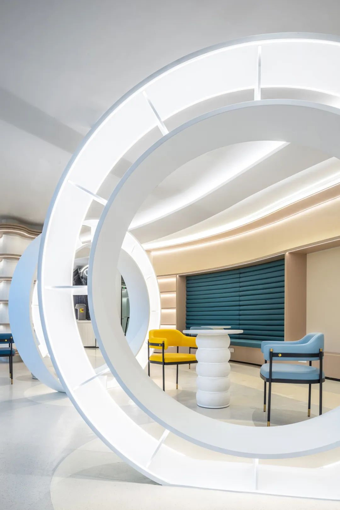 这种定制思维延伸至办公功能区。一楼员工中心的家具全部采用模块化设计,桌椅可自由组合挪动,员工能根据需求DIY出派对、培训或团建场景——当传统办公家具被赋予“可变性”,空间利用率提升40%以上。而分散在各楼层的100余间会议室,更是定制家具的功能化体现:从容纳2人的电话间到30人的研讨室,家具尺寸、材质均按空间用途专属设计,搭配智能会议系统,彻底解决“抢会议室”的办公痛点。