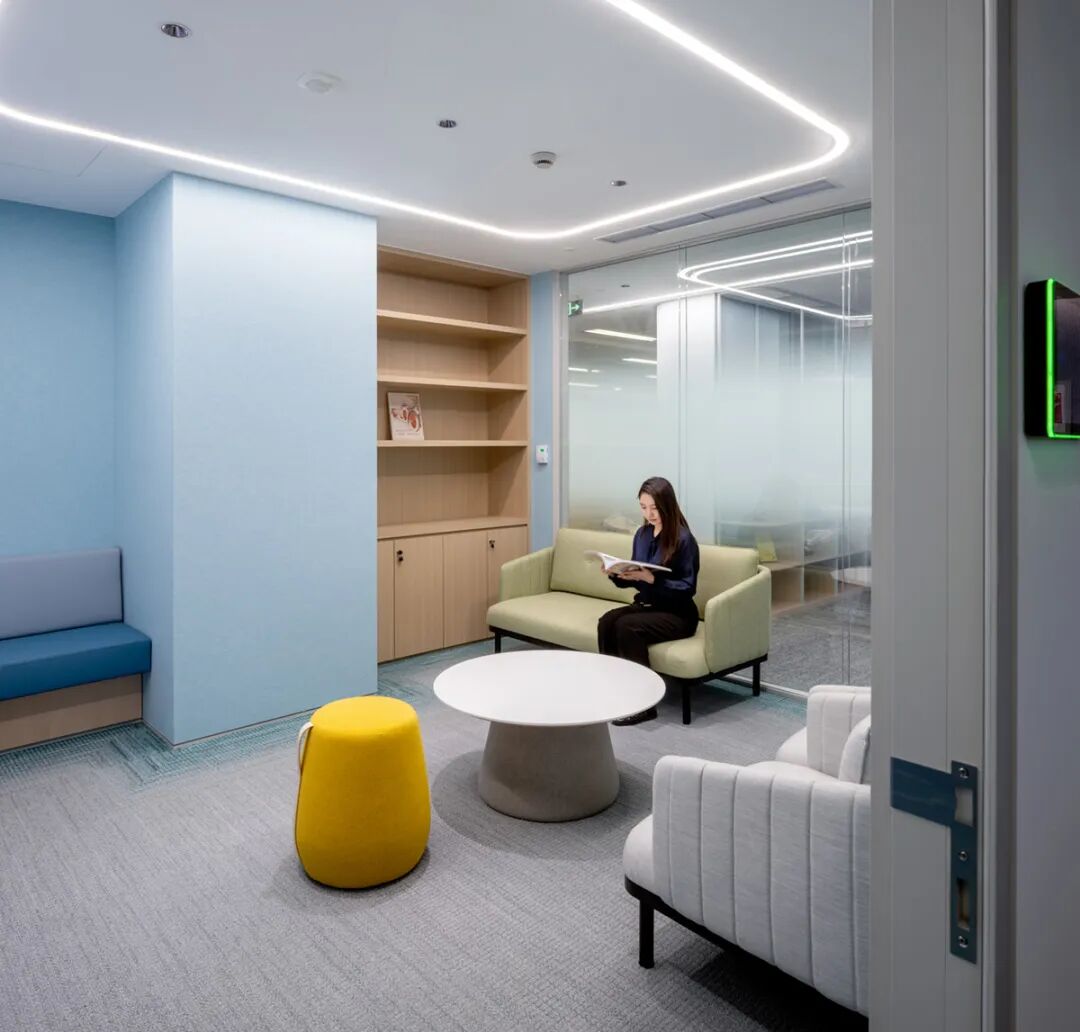 健康关怀延伸至细节末梢:母婴室配备恒温操作台与隐私帘,冥想室采用隔音棉与自然木纹家具,健身房与淋浴间的设置则呼应了“工作与生活平衡”的需求。这些设计共同助力空间斩获LEED与WELL双铂金认证,成为国内办公环境健康标准的标杆案例。