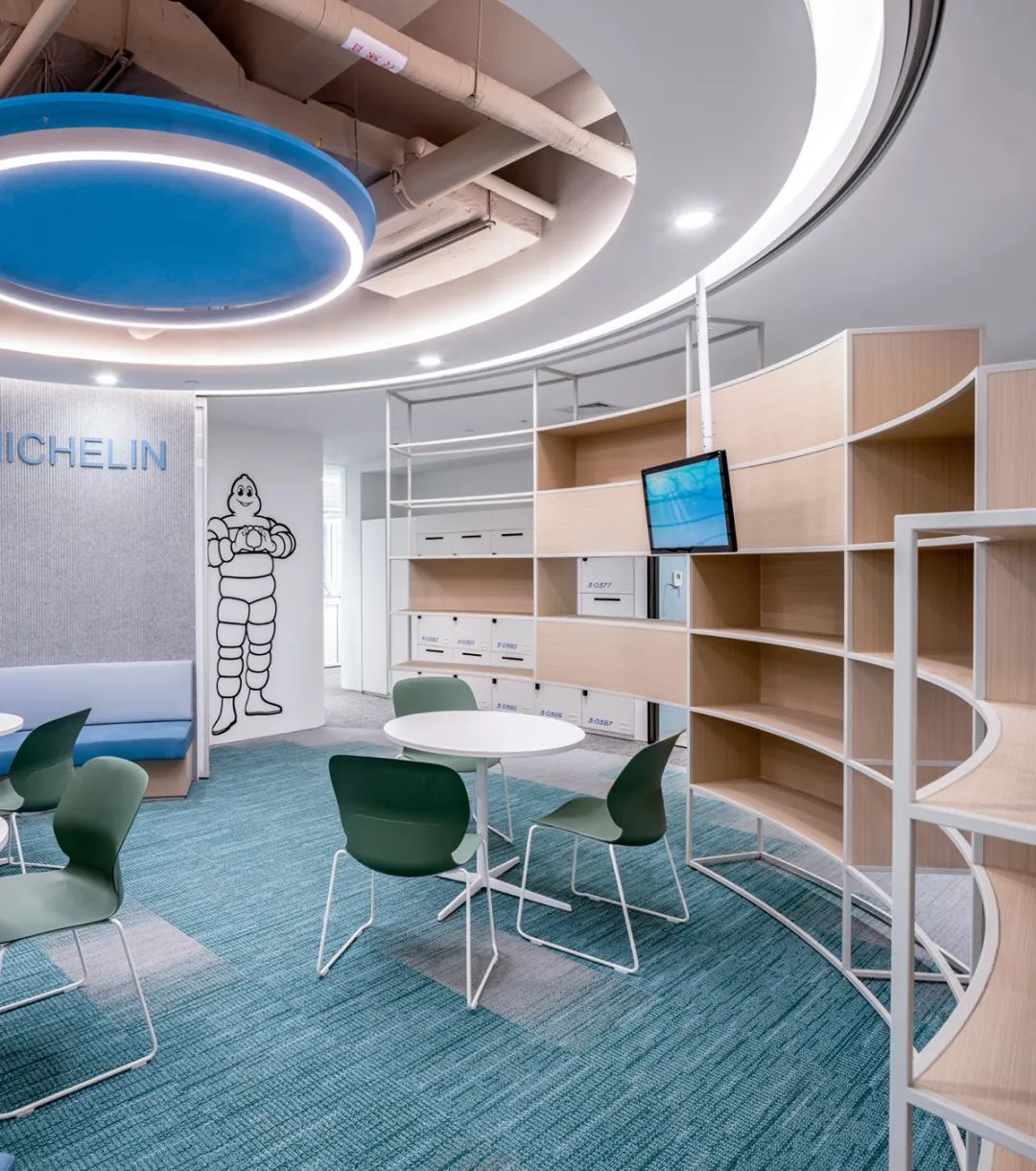 在12,000平方米的空间里,米其林将“以人为本”的理念拆解为可感知的环境细节。工位区采用“依窗优先”原则,90%的工位紧邻落地窗,配合可调节角度的百叶窗,确保每位员工日均8小时以上自然光照——这一办公环境设计细节,使员工视觉舒适度提升35%。而全员配备的电动升降桌,则通过“坐站交替”模式,将久坐办公的健康风险降低20%。