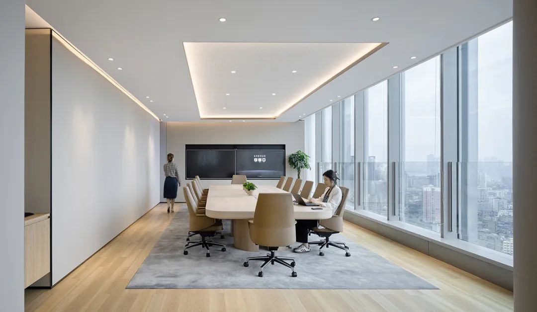 自然光线的运用更堪称「教科书级」。空间西侧整面落地窗将江景框成动态画卷,上午的阳光透过定制百叶帘在地面投下「波光粼粼」的光影,下午则斜照在极简风格的办公桌面上,让电脑屏幕反光问题迎刃而解。「我们拆掉了 12 堵非承重墙,就是为了让光线能穿透每个角落。」项目工程师的语气里带着骄傲。