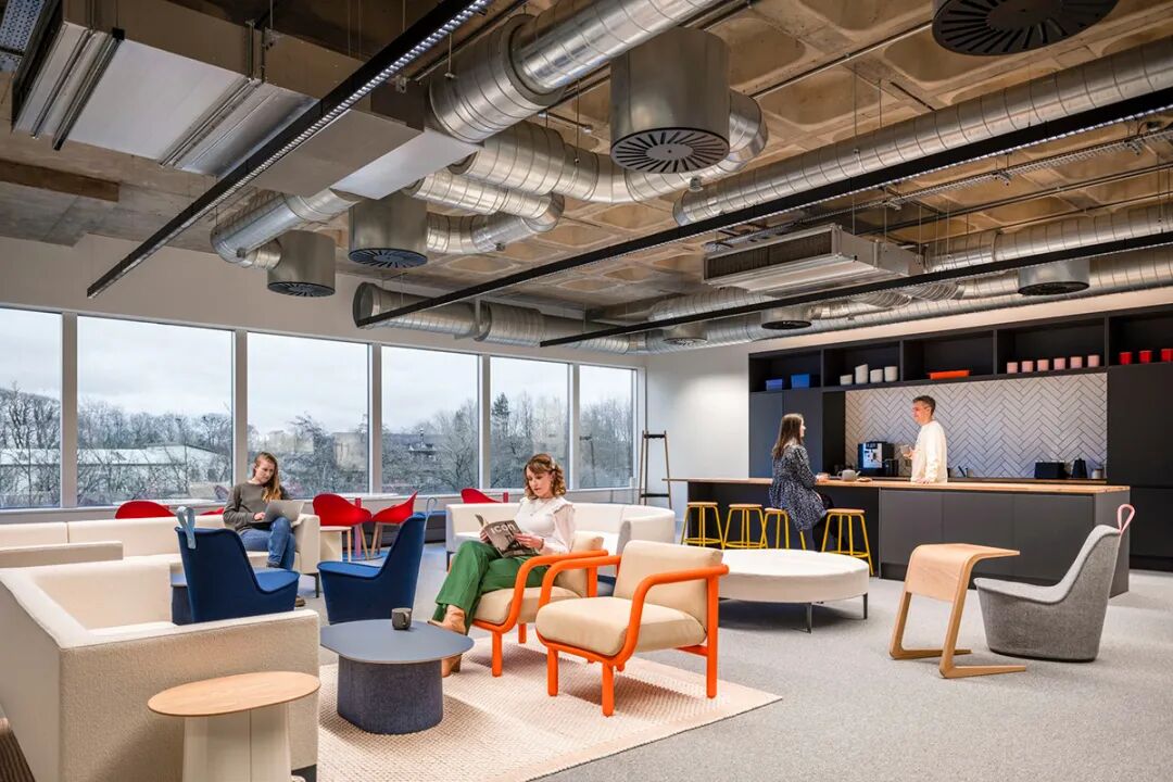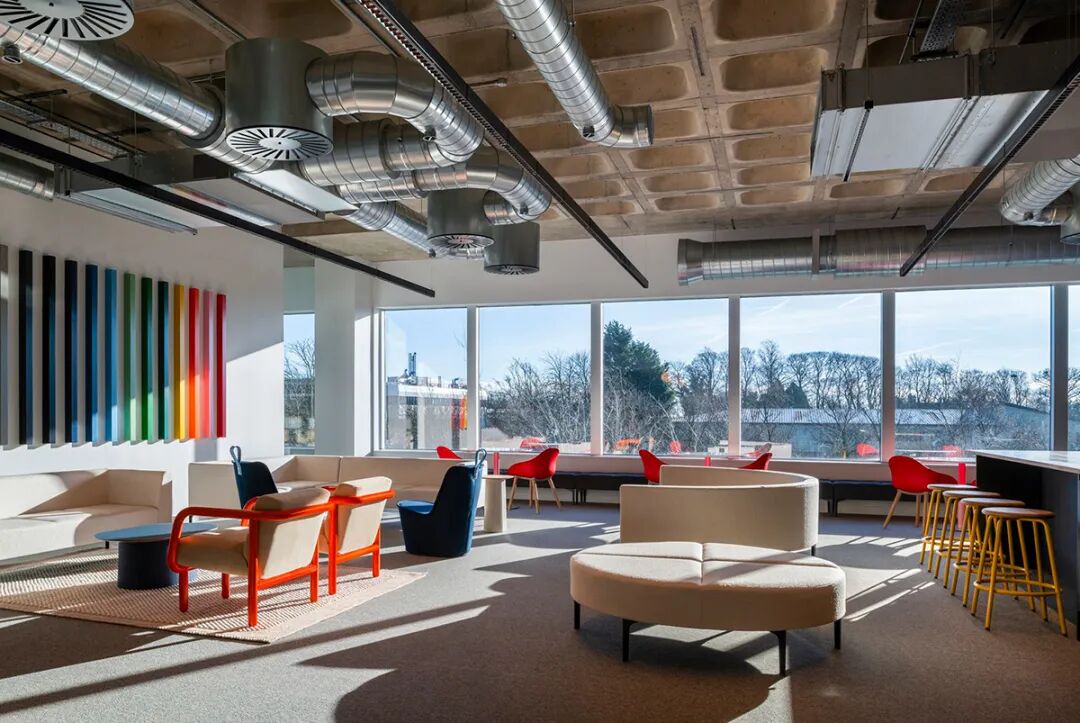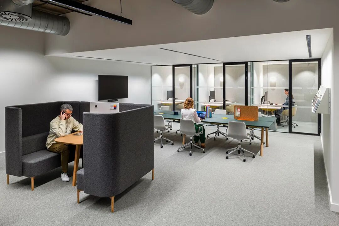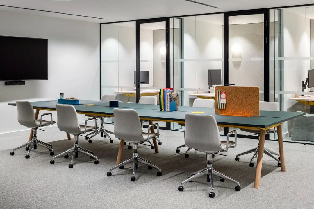 中央区域的玻璃隔断会议室是巧妙的“空间调节器”:既物理分隔了专注工作区与协作区,又通过透明材质保持视觉连通,避免传统办公室的封闭感。其周围分布着四大功能模块:可容纳多人聚餐、非正式会议的开放式厨房,配备声学电话亭的静音工作区,30张共享热桌组成的灵活工作站,以及由黑色墙面走廊串联的景观休闲区。值得注意的是,休闲区一侧的连续外窗将建筑周边的自然景观引入室内,员工在使用NaughtOne休闲家具时,能同时获得视觉放松与空间体验感。