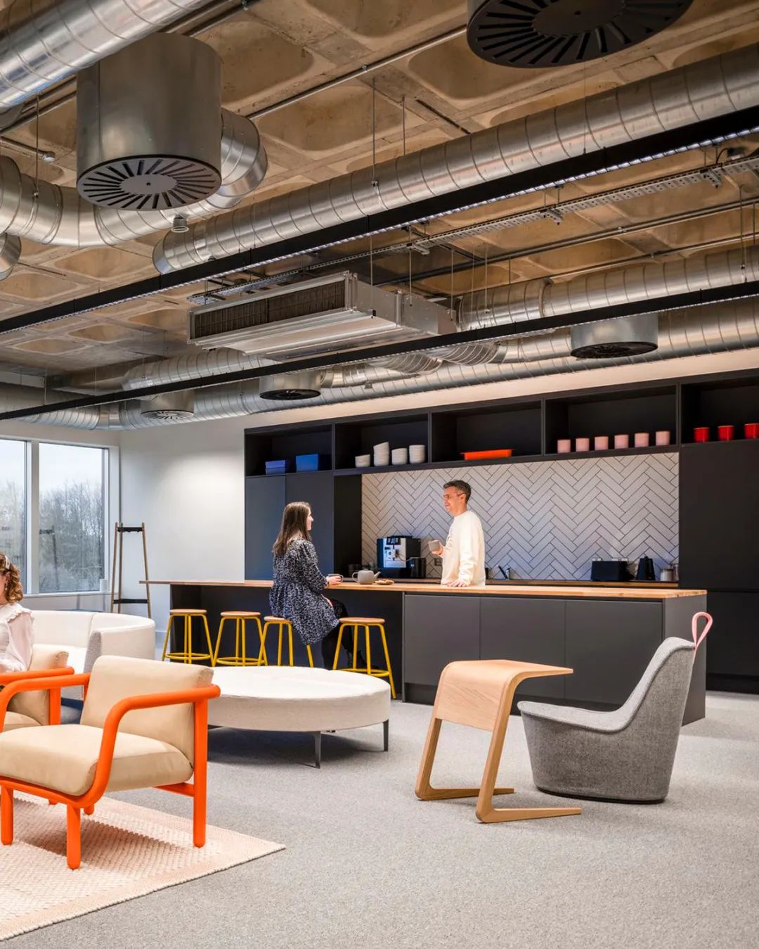 作为一家以家具设计为核心的企业,NaughtOne总部的“展厅属性”同样亮眼。这里没有刻意搭建的产品陈列架,而是让办公家具自然融入办公场景——厨房的座椅兼顾用餐与临时会议,工作站的桌架展示着品牌标志性的轻量化设计,休闲区的模块化沙发则演示了“如何用一件家具适配3-8人的不同组合”。