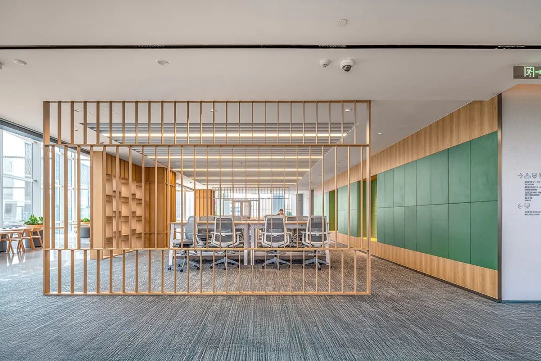 声学控制系统(吸音天花、墙面)与智能储物柜等细节,优化办公体验与健康舒适度。