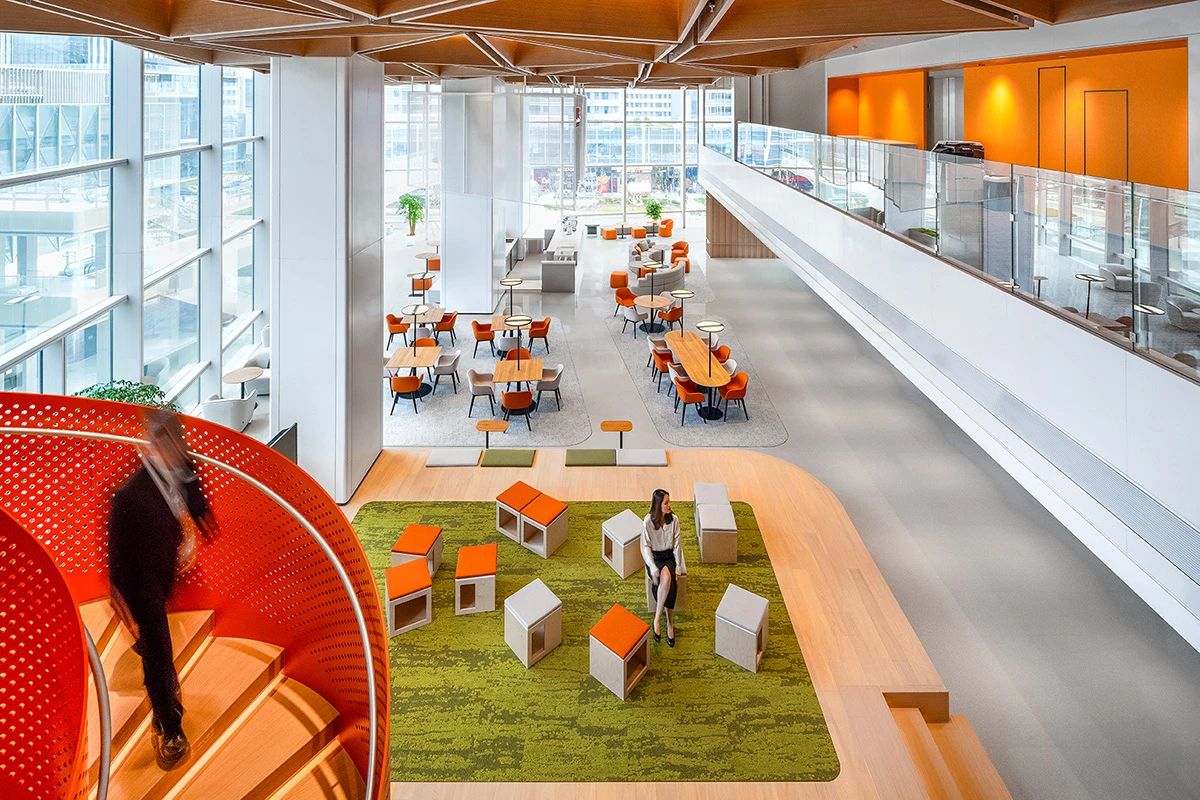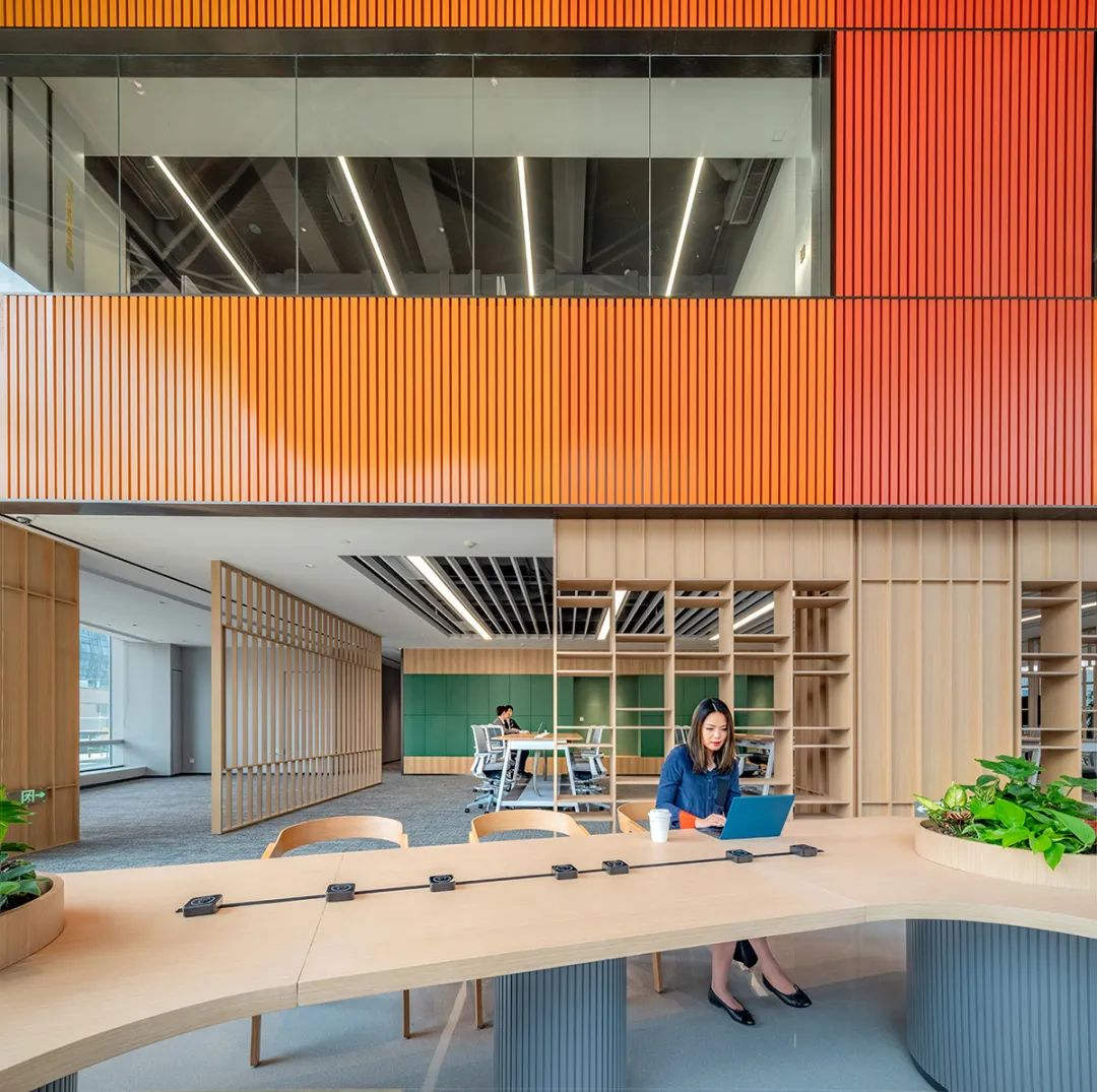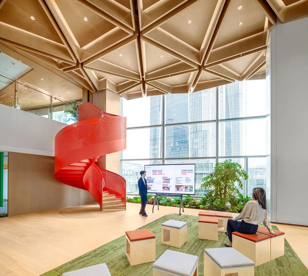 以自然元素(山林、纵谷、花园)为灵感,融入绿植与弧形布局,打造“天然氧吧”式上海办公环境,模糊工作与休憩界限。
