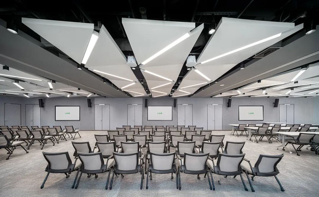 路演厅:以“纵谷”为意象,折线型设计与可分可合隔断,适配120人大型活动至中小型会议。