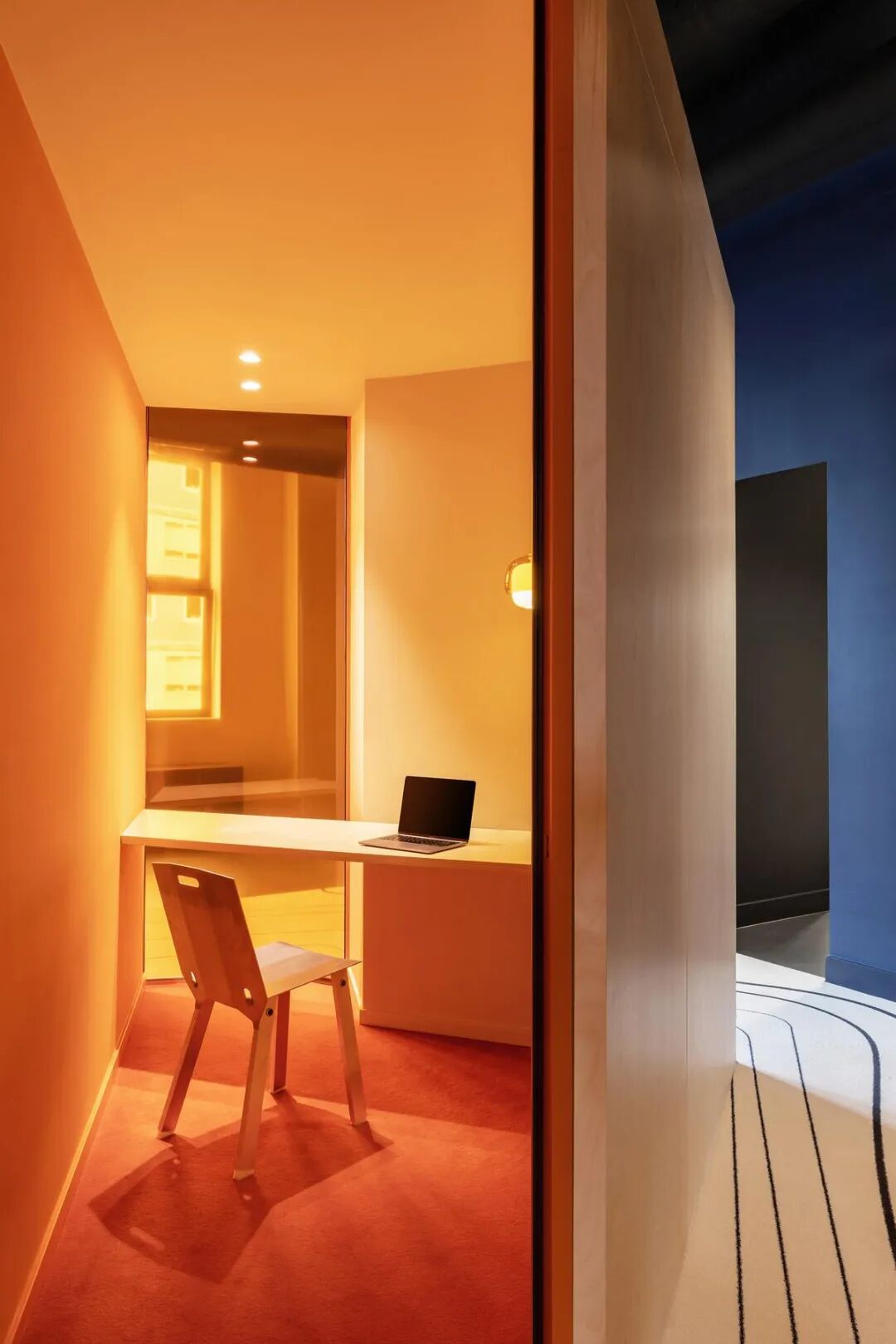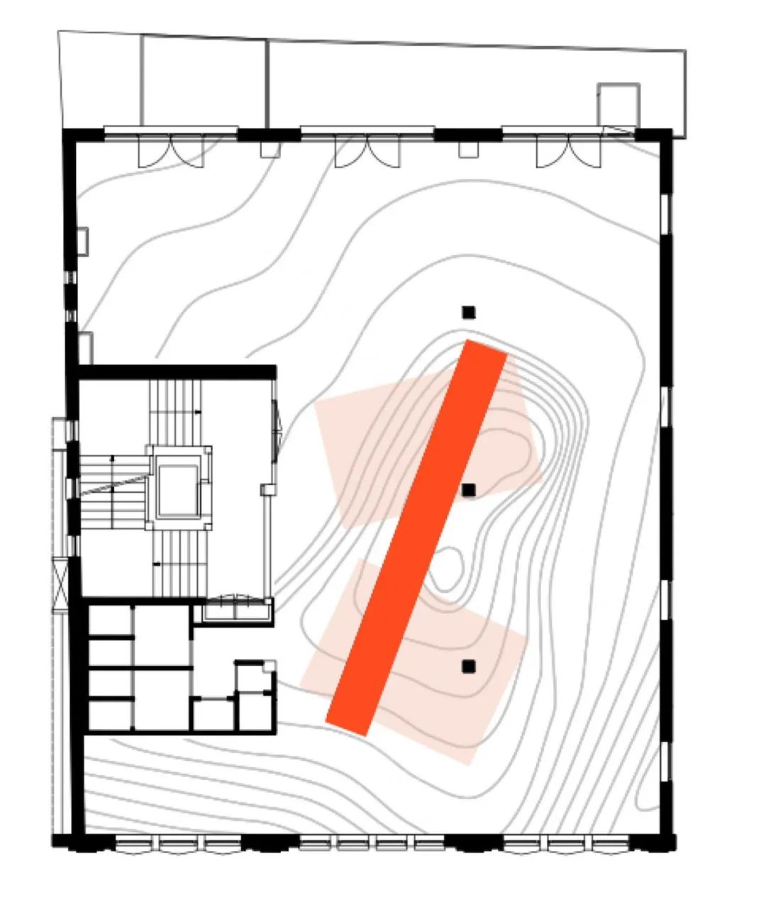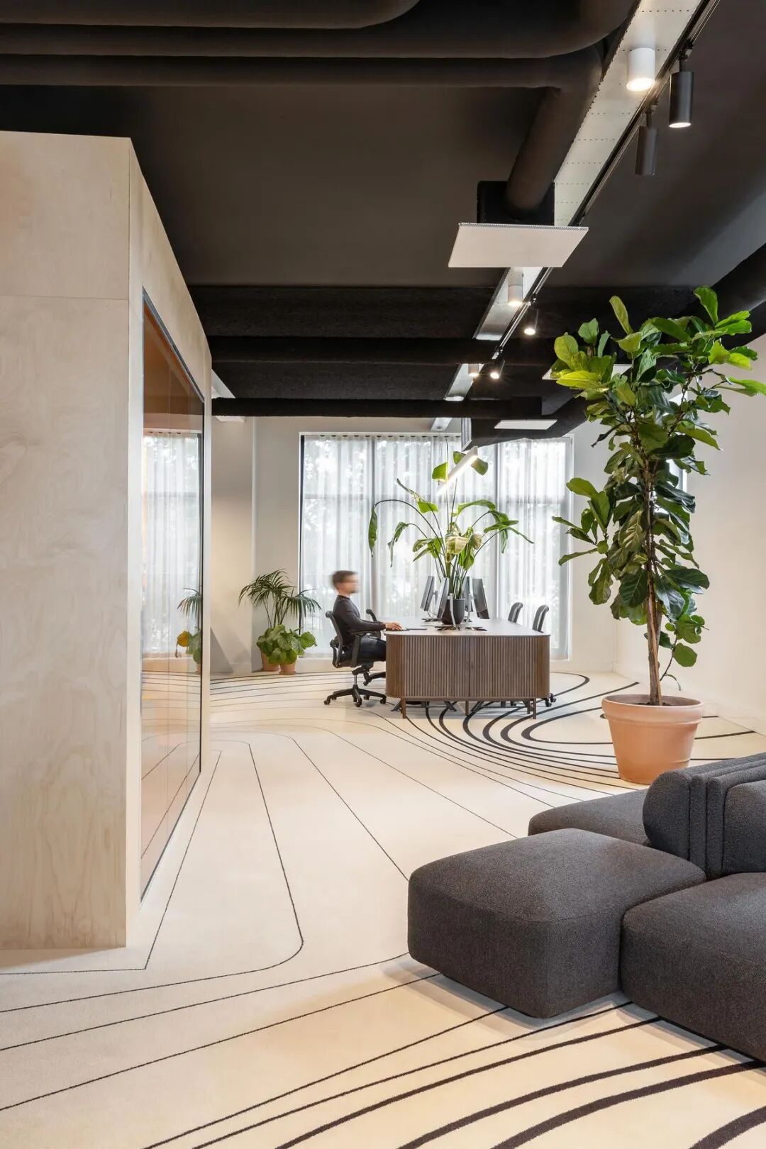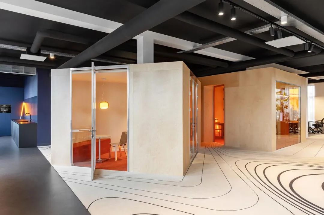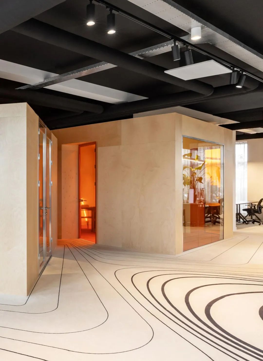 线性设计语言在此空间中得到极致运用。从四扇玻璃门延伸的橙色北极线,到隐喻海拔轨迹的墙面分割,这些线条不仅引导空间动线,更成为办公环境设计的隐形骨架。设计团队定制的EGE地毯采用环保的Econyl再生尼龙纤维,黑色Forbo亚麻地板则以天然材质传递温润质感,二者共同构建出符合可持续发展理念的地面系统。