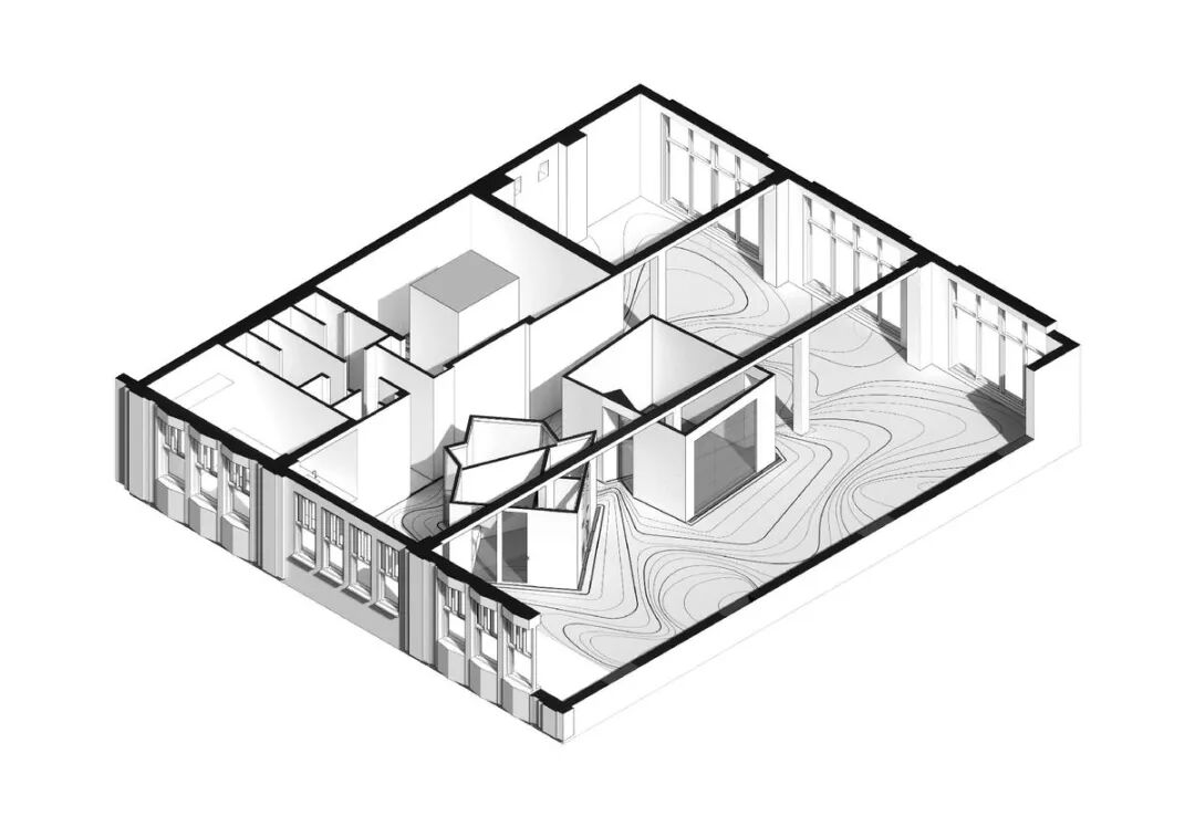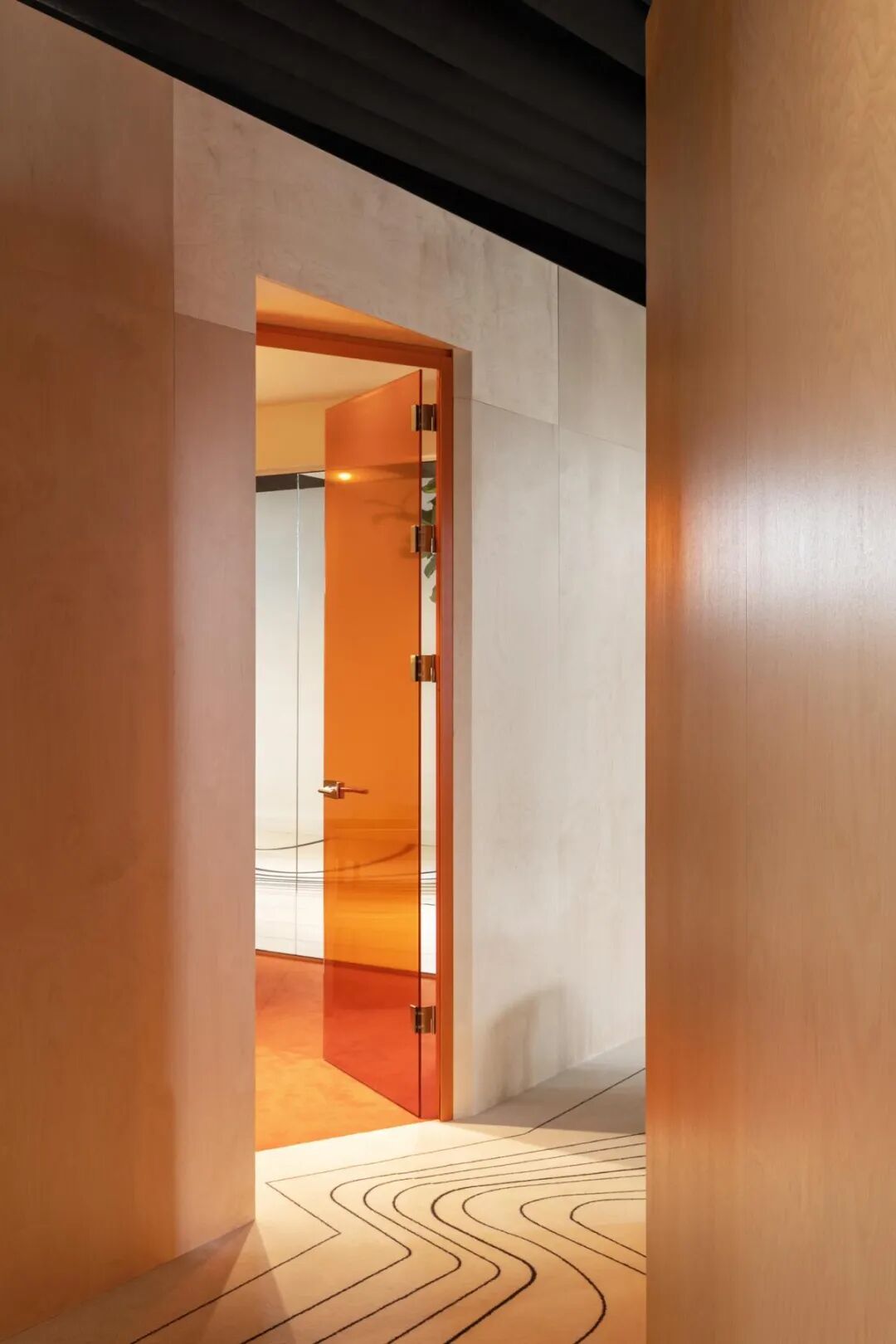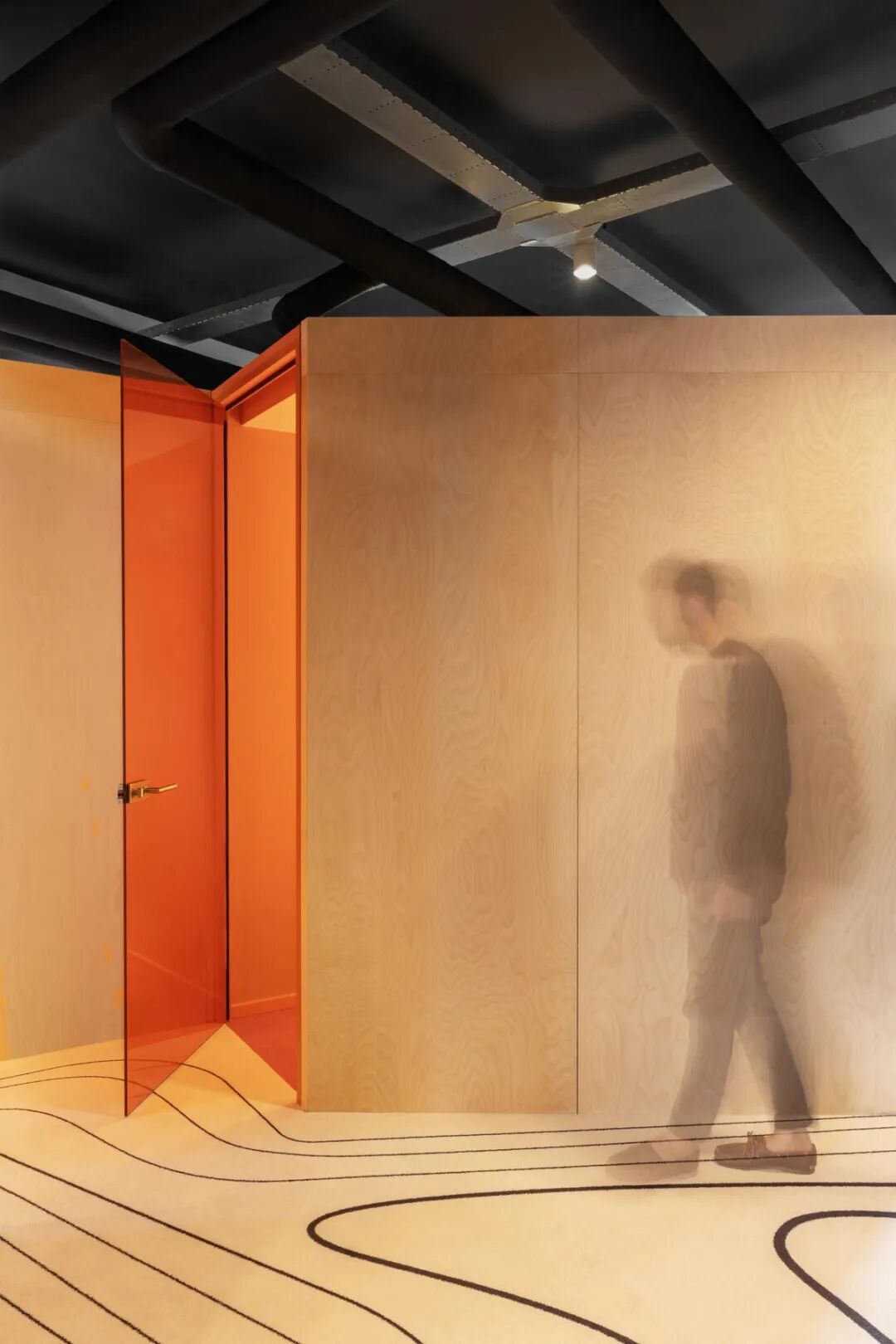 空间核心矗立的两组木质体块,成为品牌诠释的关键载体。它们既像山脉剖面图中的等高线体块,又象征两家企业如同山巅磁极舱体般的动态平衡关系。一道醒目的橙色"北极线"贯穿其中,如同罗盘指针般串联起功能分区,既呼应企业"方向、行进与探索"的精神内核,又通过视觉符号完成了跨越界限的融合理念表达。这种设计既划分了独立办公区域,又保持空间的视觉贯通,完美适配小面积空间的功能需求。
