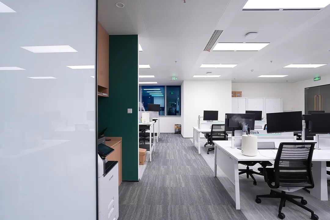 开敞办公区:极简风格的白色与灰色办公家具,提升空间轻盈感。