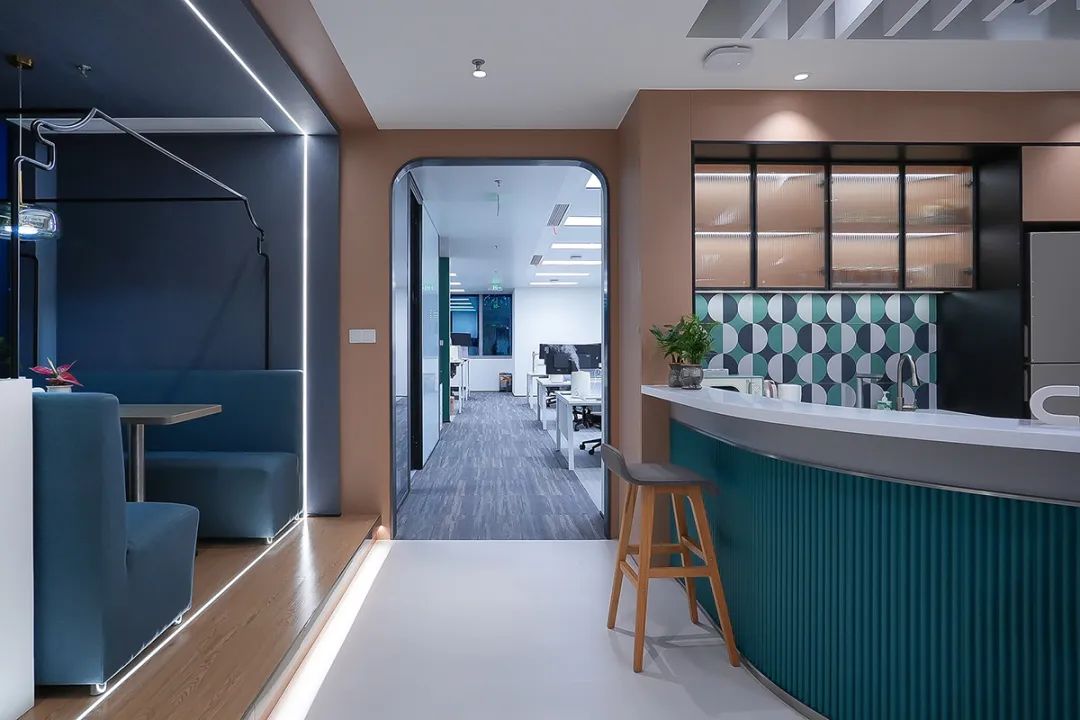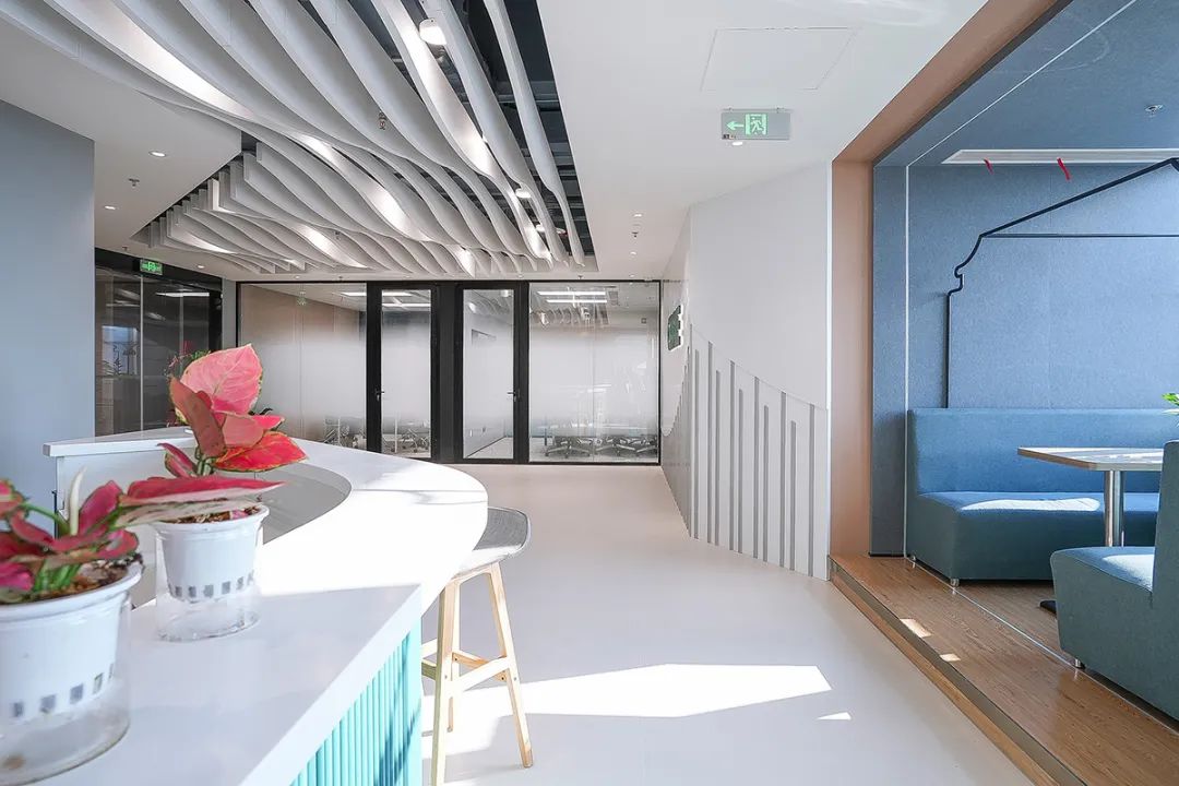线性叠加设计手法,如波浪形天花与弧形门洞,赋予办公环境动态美感。