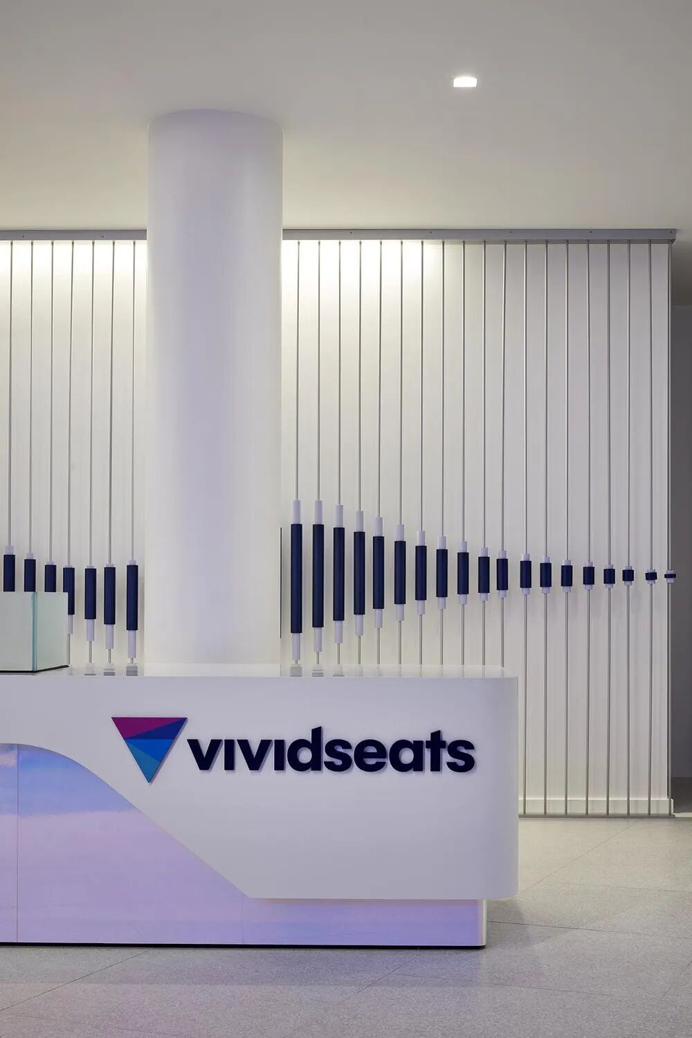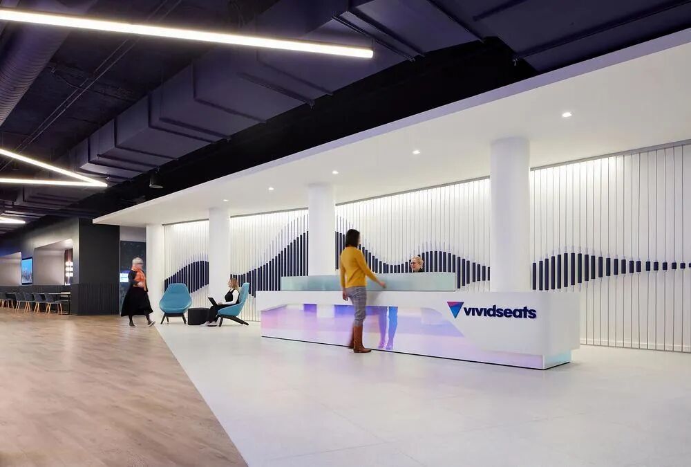 走进这座始建于19世纪的Marshall Field大楼,最先冲击视觉的不是百年大理石地面或拱形玻璃窗,而是从入口延伸至中庭的锯齿状灯光装置。这个由品牌logo折线元素演化而来的定制设计,既是照明系统也是空间导视——暖白色光束在挑高8米的大厅里划出动态轨迹,自然引导访客走向印有巨型Vivid Seats标志的接待前台。"我们希望每个走进来的人,第一眼就被品牌的活力击中。"设计团队负责人在采访中强调。