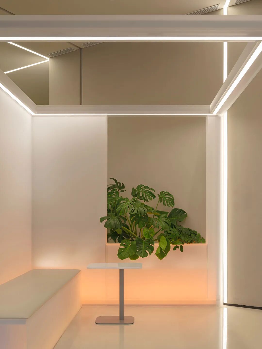 在这个被业内称为「未来极简」风格的办公空间里,定制家具成为连接超立方体理念与实用功能的关键纽带。设计团队摒弃传统办公家具的标准化模块,将「发光方盒子」的三维形态语言延伸至每一件办公家具:接待区的弧形服务台采用与空间主视觉同色系的磨砂树脂材质,台面嵌入可编程LED灯带,既呼应整体灯光设计,又通过高度可调节的模块化组件满足不同时段的使用需求。