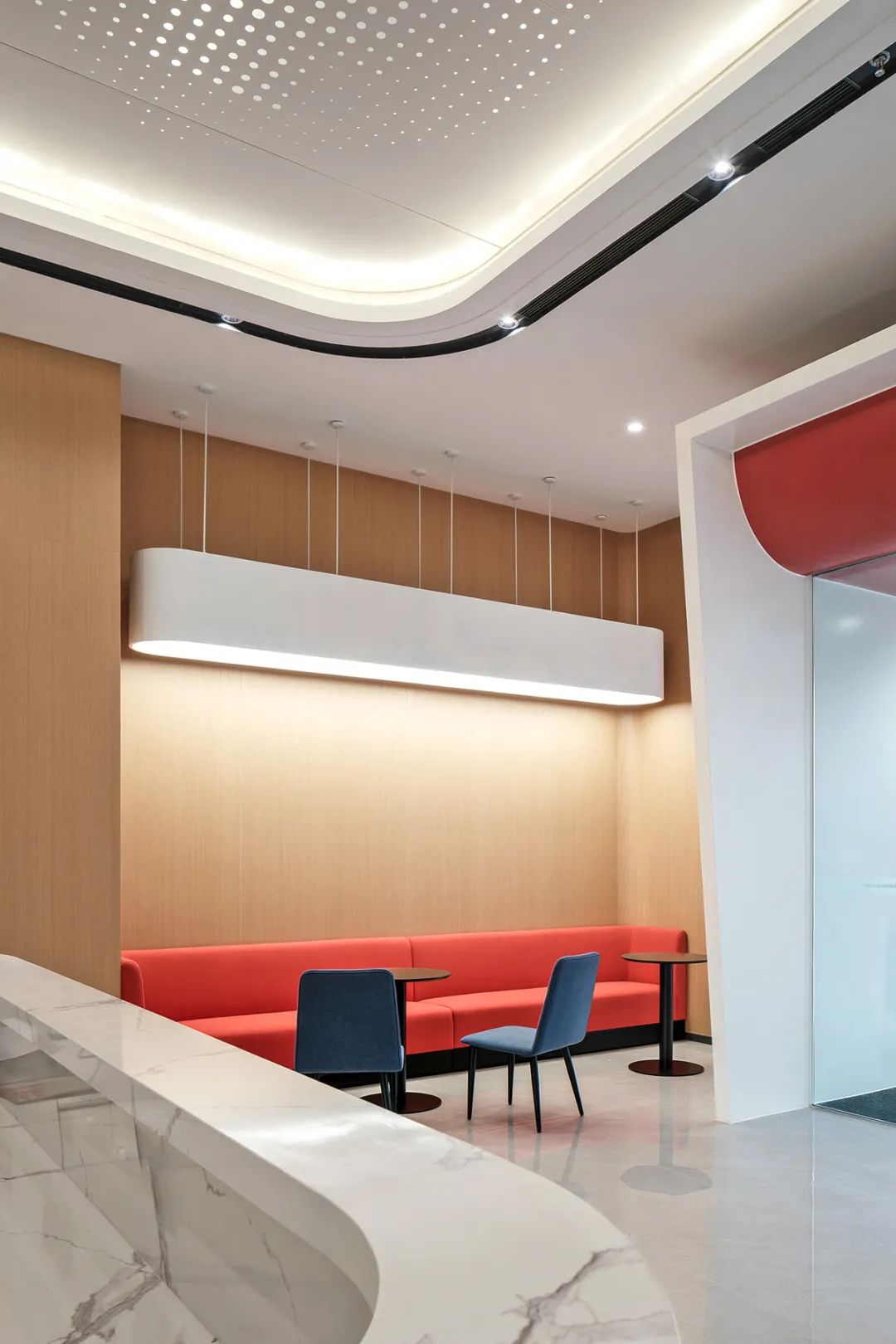 转过前台进入等候区,办公环境的温度感开始显现。设计师摒弃了常规的金属座椅,定制了一组中国红布艺沙发,15度倾斜的靠背角度经过人体工学测算,配合3厘米厚的高密度海绵垫层,让等候不再是煎熬。沙发旁的原木边几采用FSC认证的白蜡木,与极简的白色吸顶灯形成材质碰撞,这种"科技冷感"与"自然温度"的平衡,恰是华为海思"开放包容"理念的空间转译。