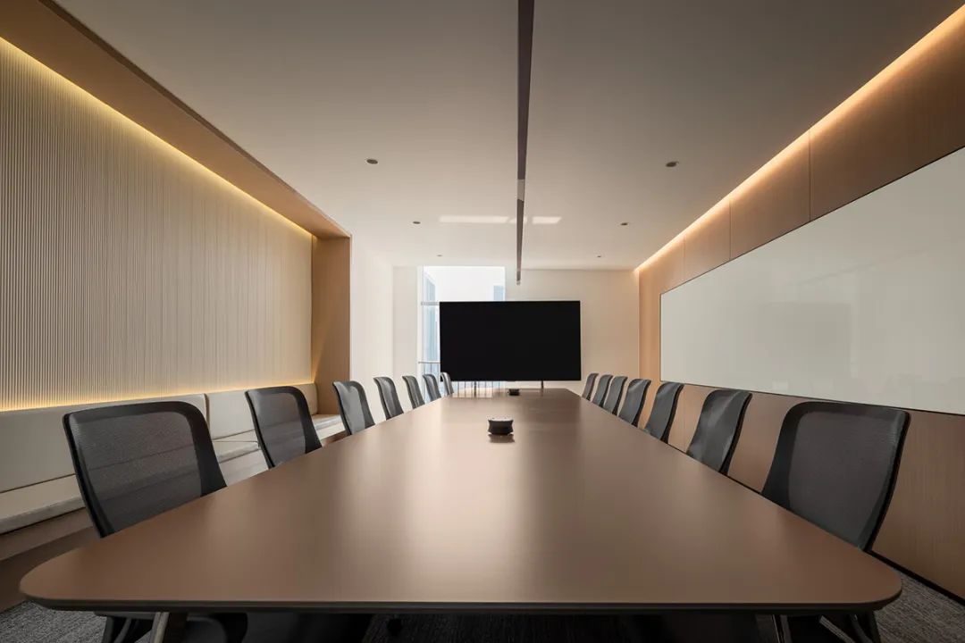 更值得关注的是会议桌的设计细节:桌面采用纳米级陶瓷材质,耐高温且防刮擦,边缘处嵌入的隐形灯带与顶部软膜灯光形成光影呼应。木质墙面的柔和感搭配这组定制会议家具,使整个空间在保持科技感的同时,散发出舒适温暖的气息。据南芯科技行政负责人透露,自从新办公场所启用后,员工主动延长会议参与时间的比例提升了30%,"定制家具带来的不仅是视觉上的简洁,更是功能上的人性化思考"。