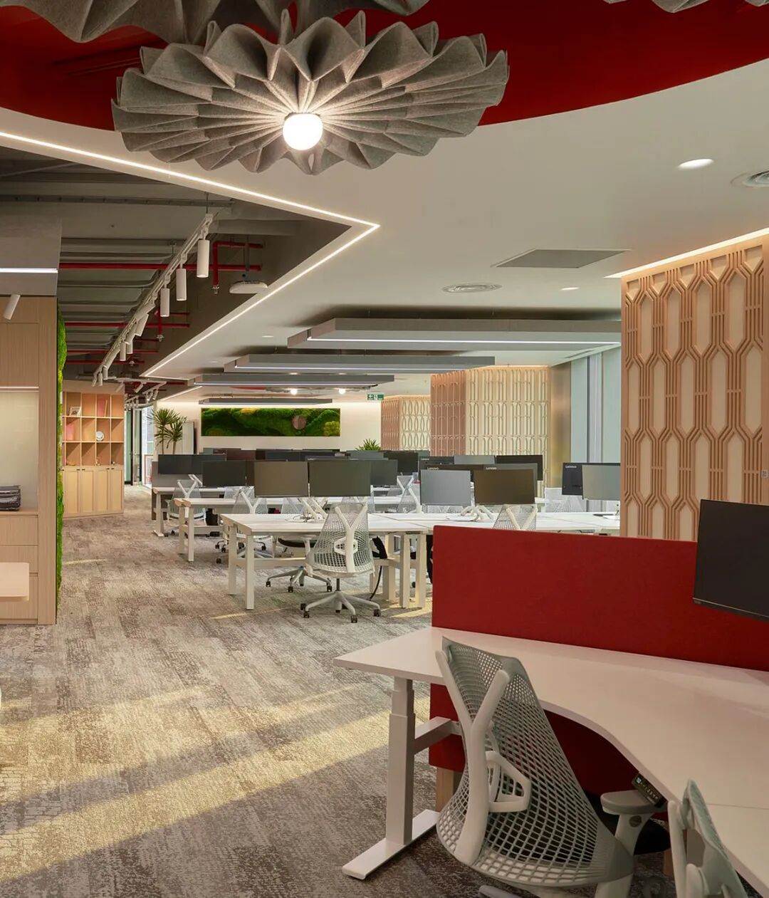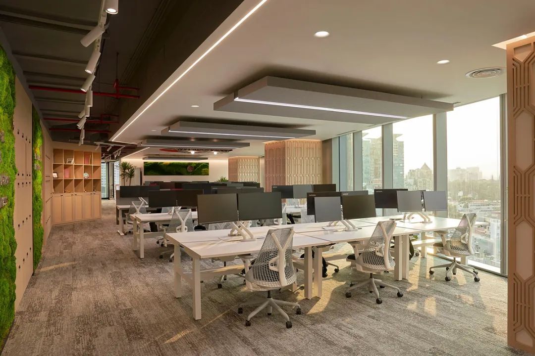 设计团队将前沿工作场所理念引入,打造以人为本、关注员工健康福祉的混合型办公环境。开放式布局、充足采光、亲生物设计、灵动多元的工作场景、兼顾专注与协作的多样性、先进科技设施的引入,让这里成为可持续演绎的超强适应性工作空间。