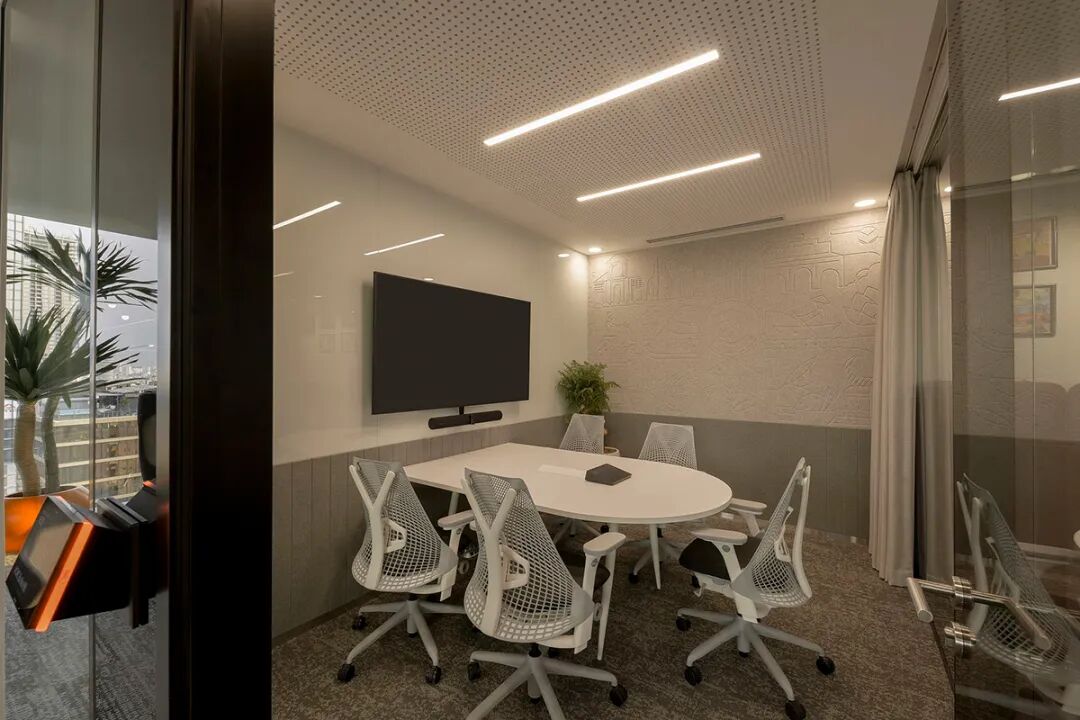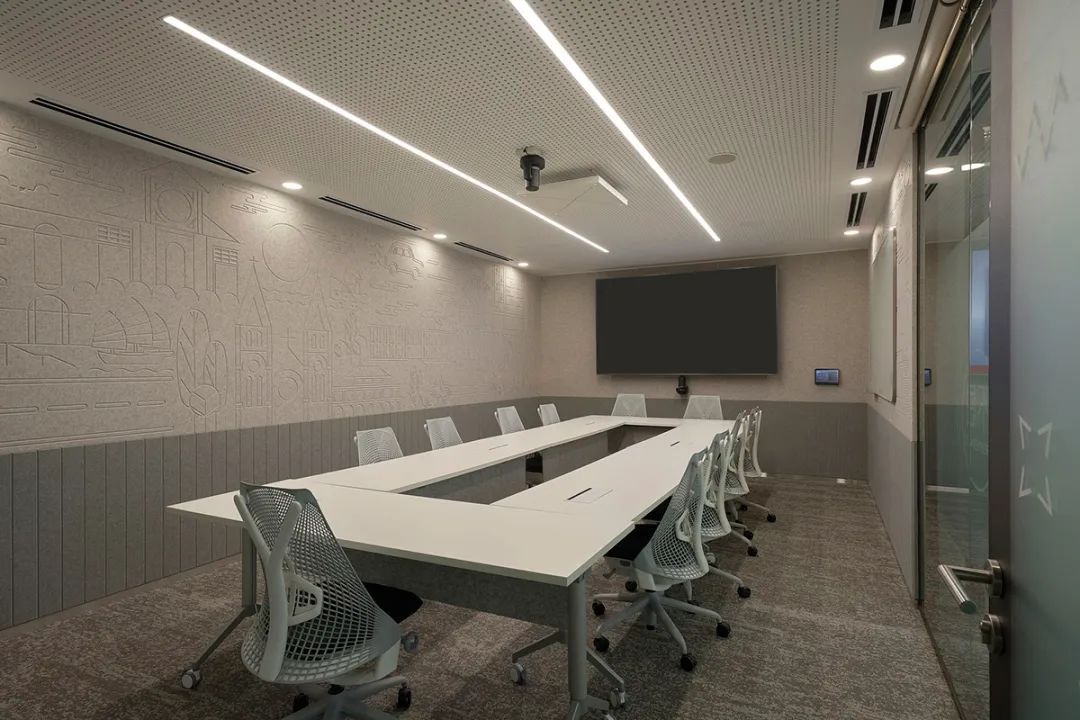 天花板上的嵌入式灯与长条形灯具确保充足照明,而投影幕布和电视则满足现代会议需求。这里不仅是决策场所,更是团队协作的催化剂。