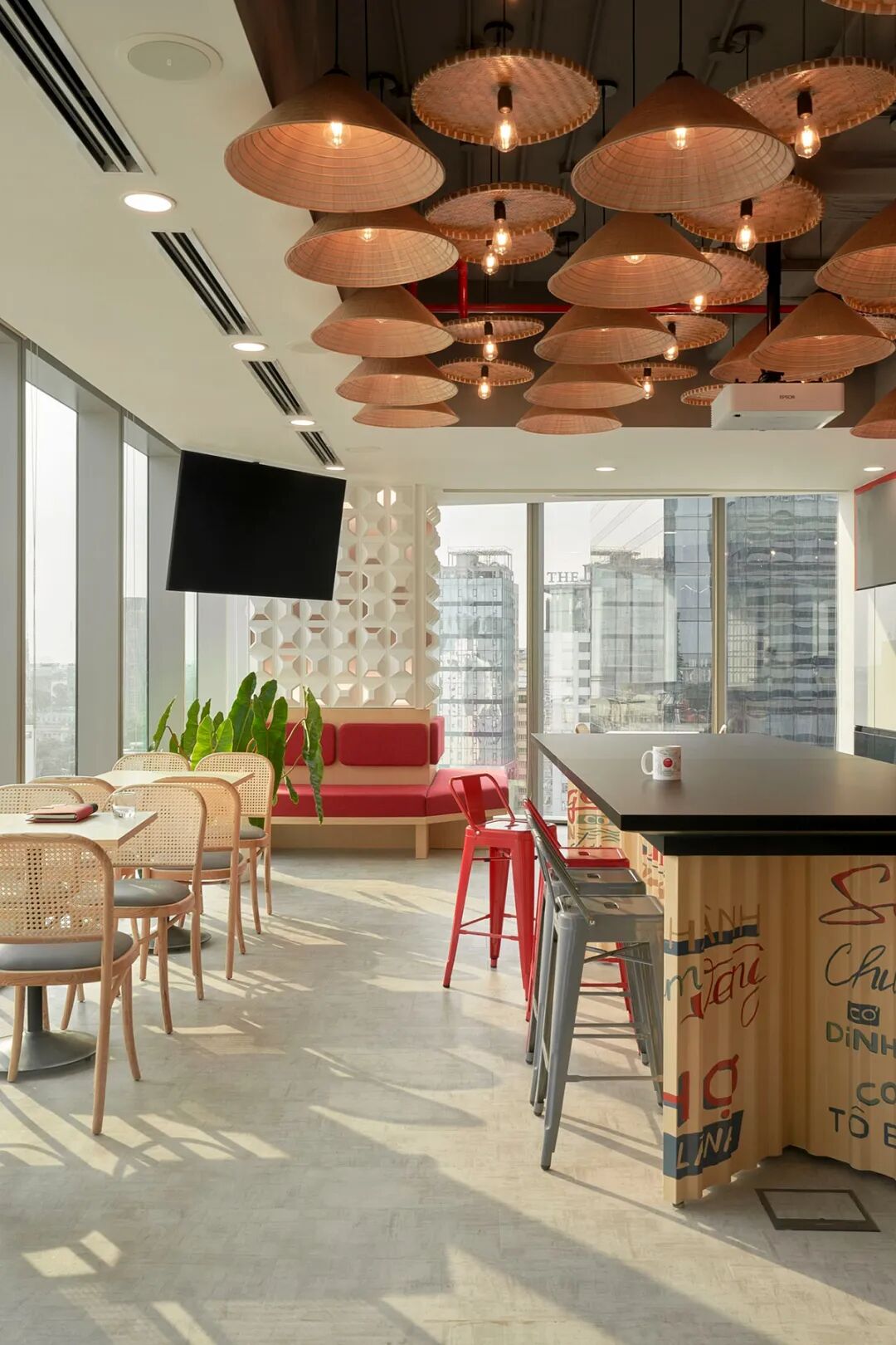 除了雕刻柱,设计团队还在细节中融入地域文化。例如,办公家具的线条灵感源自西贡传统建筑的飞檐,墙面装饰则借鉴了当地织物纹理。这种“大符号+小细节”的 approach,让文化渗透在空间的每一个角落,而非停留在表面。