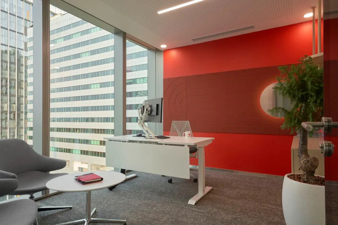 会议室的设计同样精心。白色长桌搭配黑色网布办公椅,地面铺有灰色方块拼接地毯,黄色线条点缀其间。背景墙左右两侧的红色竖条装饰,既呼应武田品牌色,又增添视觉层次。右侧储物柜上的紫色植物,为严肃的会议空间注入自然气息。