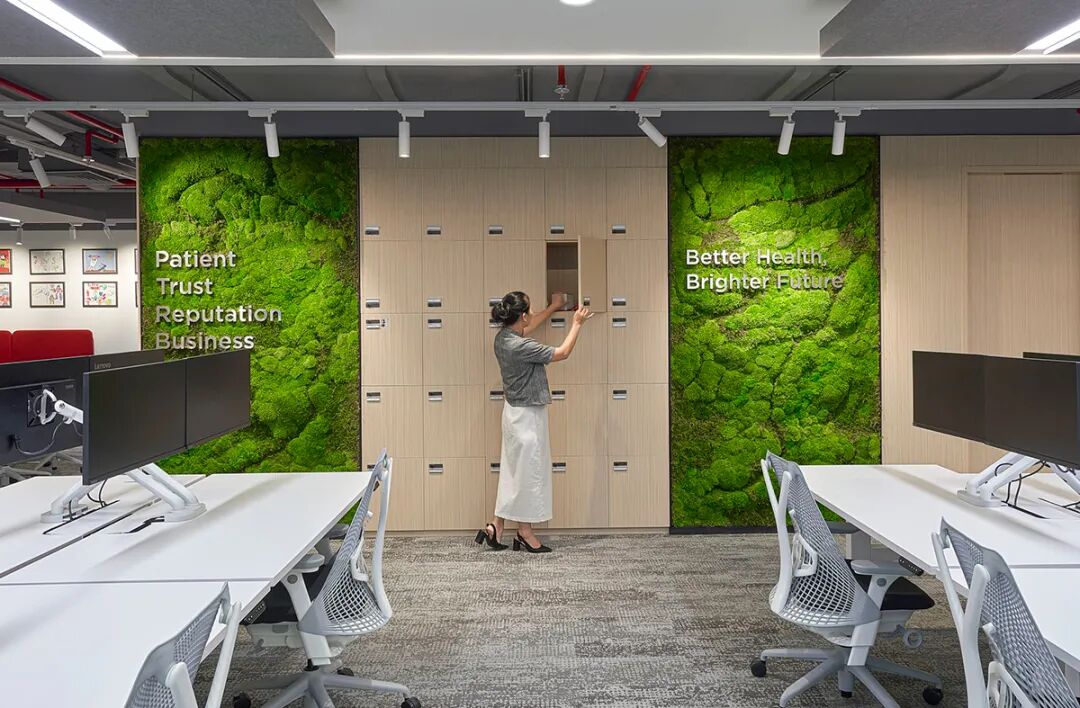 开放式布局是办公环境设计的核心。大面积的落地玻璃窗引入充足自然光,窗外城市景观与室内绿植相映成趣。办公家具的选择尤为讲究:白色弧形办公桌搭配黑色网布办公椅,既符合人体工学,又体现医疗行业的专业感。桌下的木质柜体和带锁抽屉柜,则兼顾了收纳需求。