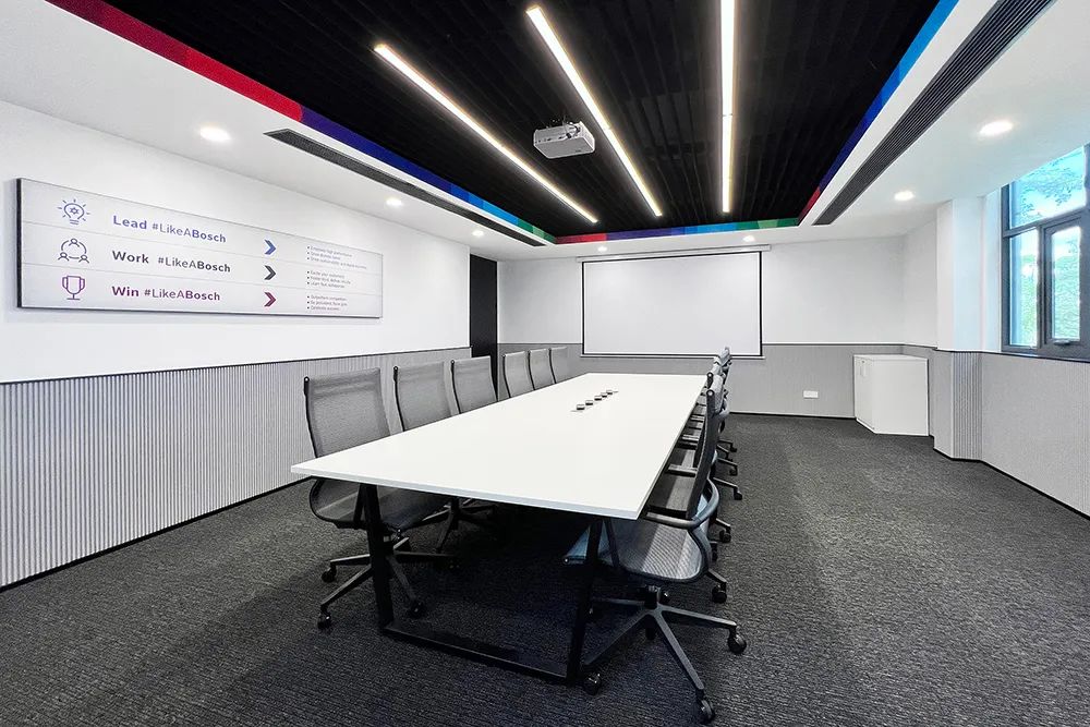 在封闭办公室,玻璃隔断的磨砂条纹密度经过特殊计算——从外面看是均匀的博世 logo 纹理,确保隐私性;从内部看却几乎透明,保持开放视野。而哑光 PVC 磁性白板墙则解决了传统会议室的痛点:员工可用磁贴固定文件,直接书写讨论,会后擦除即可,墙面始终保持整洁。