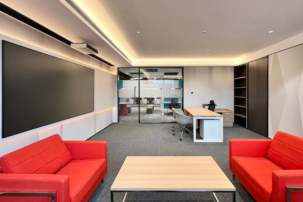 “我们拆掉了 12 面实体墙,用玻璃隔断和模块化办公家具重构了 80% 的空间。”项目建筑师介绍道。在开放式工作区,悬挑式白色天花板下悬挂着带彩色边缘的方形灯具,下方对应排列着可升降办公桌,员工可根据需求自由组合成 2 人协作单元或 8 人项目组。这种“家具即空间”的设计,使办公人数在不改变硬装的情况下可弹性增减 30%。