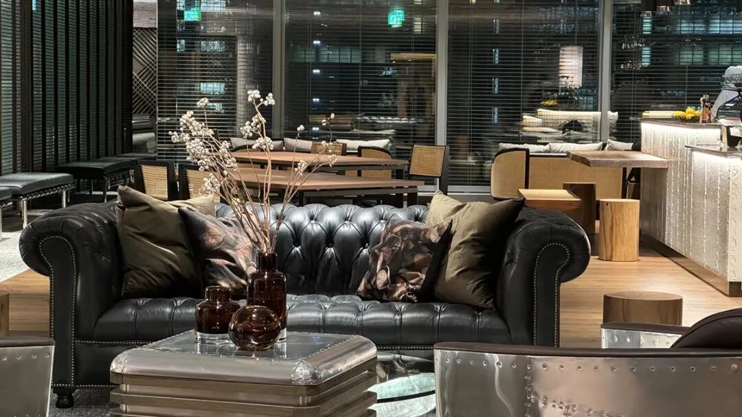 Rest area and bar counter: Soft lighting highlights the textures of stone, mirrors, and metal, creating a peaceful atmosphere.