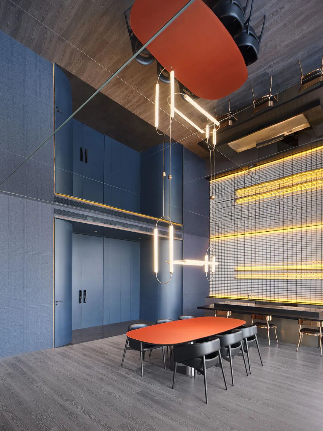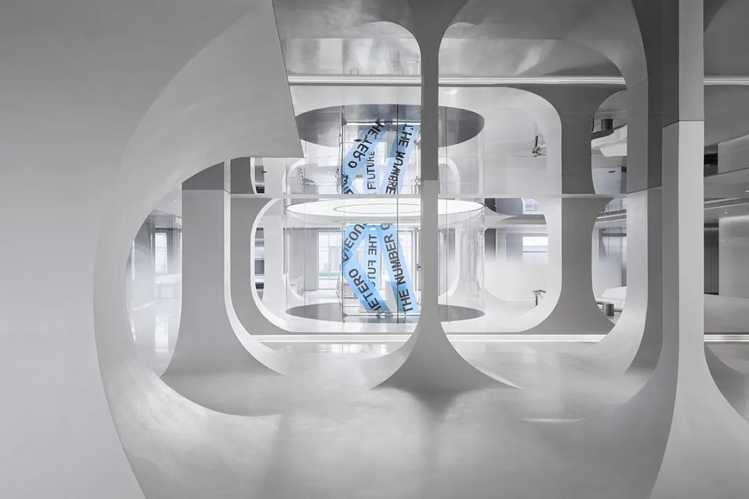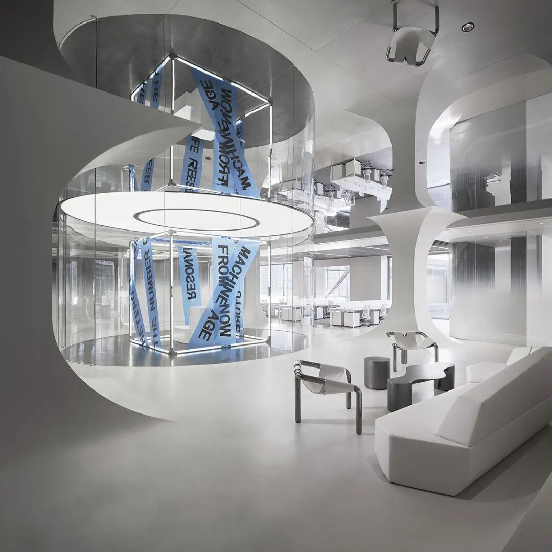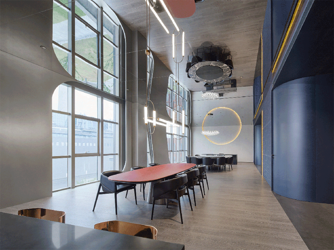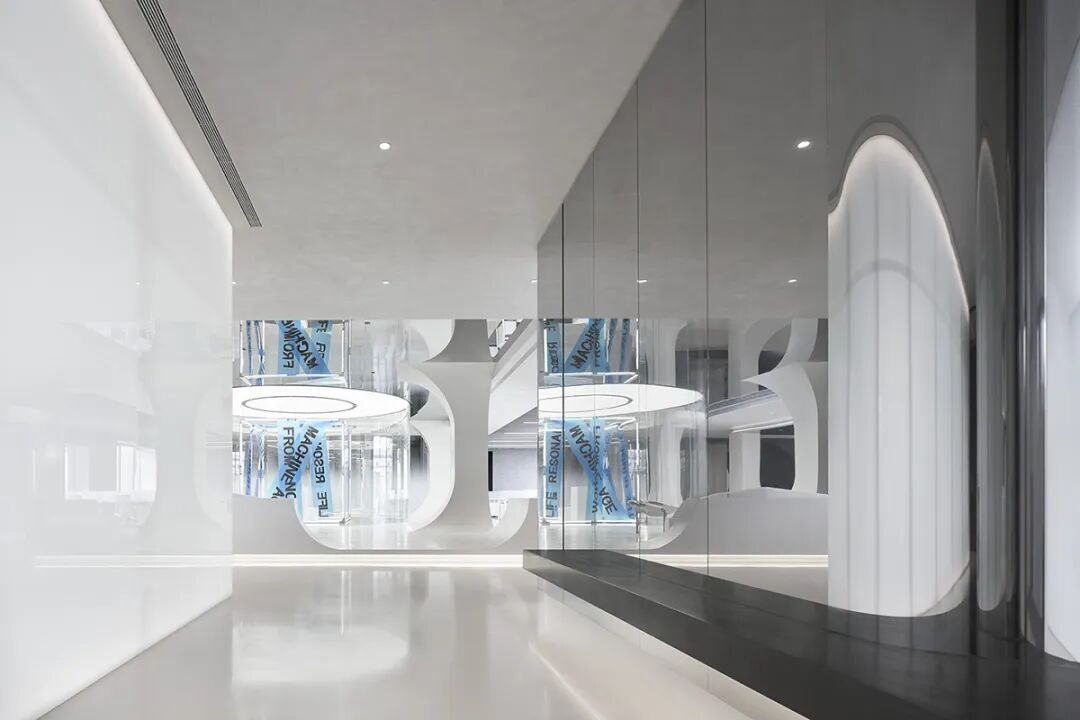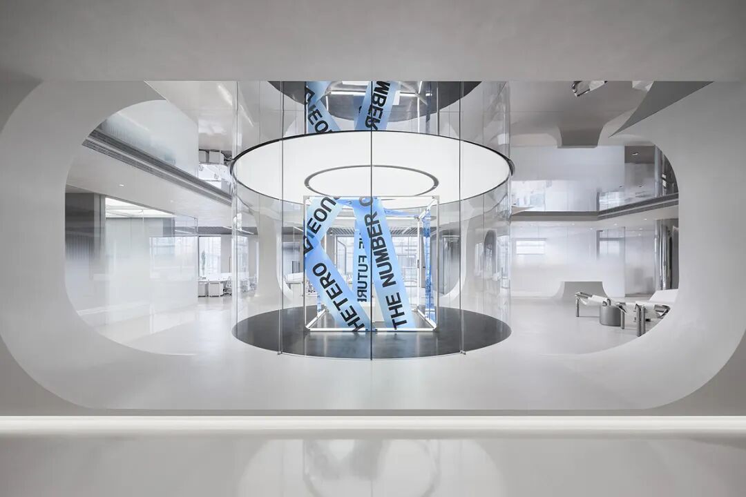 The embedded BOX display area is inspired by wormholes and extends the space through customized organic furniture installations. The core art installation adopts a square and square fusion design, with transparent materials melting the boundaries, combining the dual attributes of enterprise display and functional hub. The adjacent reception areas are connected by migratory lines, and the mirror stainless steel columns are transformed into a storage system, reflecting the neat aesthetics of customized furniture.