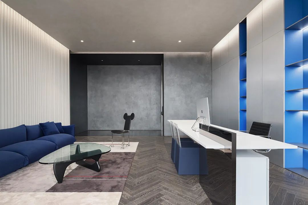 The open office area achieves internal and external penetration through floor to ceiling doors and windows, and the top of the dark grille forms a visual extension with the ground. The sunken conference room utilizes the original building structure, with columns wrapped in aluminum panels continuing the arc details, and the office furniture system forming a dialogue with the urban landscape of Lujiazui. The General Manager's Office interprets the emotional tension under the essence of simplicity through the refined lines of customized furniture.