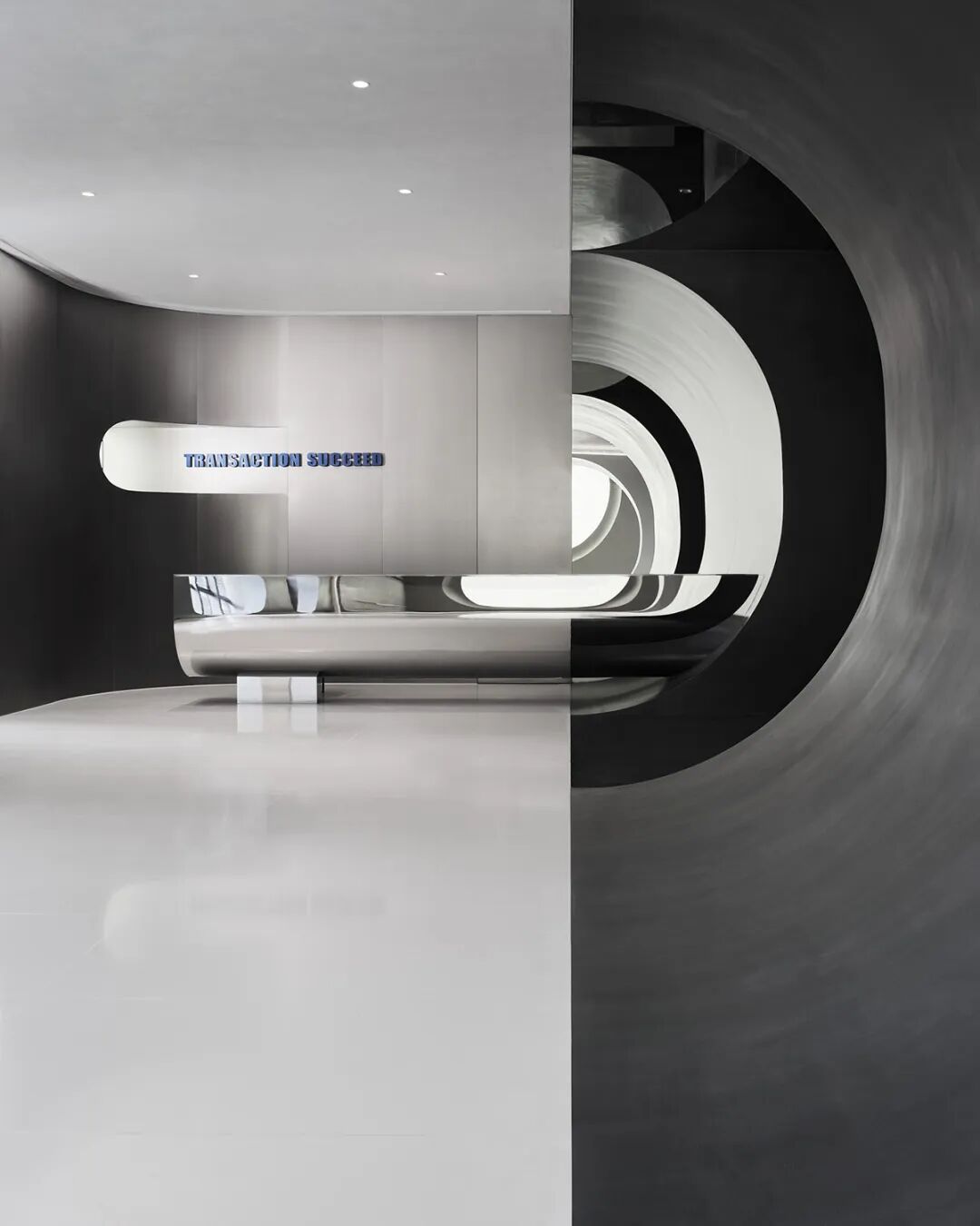 The entrance adopts multiple mirrored ceilings and facade designs, creating a deep visual attraction between the virtual and real. Customized curved window openings run through the space, echoing the characteristics of building glass curtain walls and dissolving the coldness of the financial industry with smooth curves. The collision and interweaving of deep and shallow materials indicate an exploration of office furniture and spatial aesthetics.