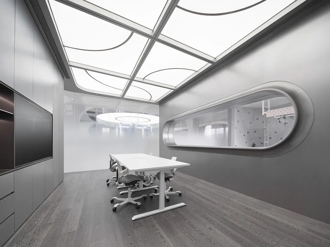 The entertainment area is equipped with customized themed furniture: the music room and spacecraft incorporate black warrior elements, the learning area has a luminous light film top that breaks the traditional rhythm, and the climbing wall and physical training area showcase the humanistic care of the office environment.