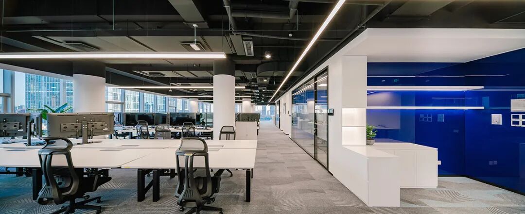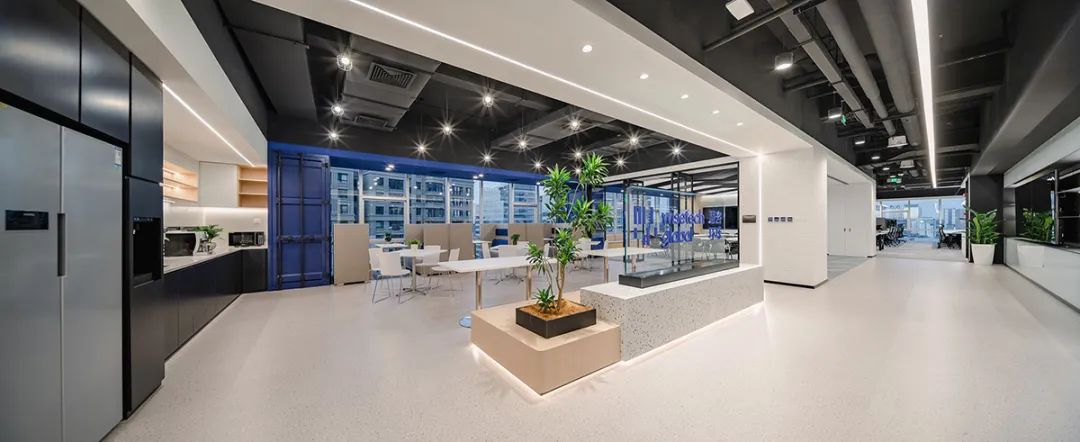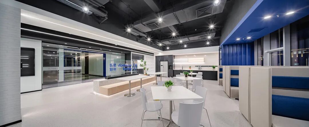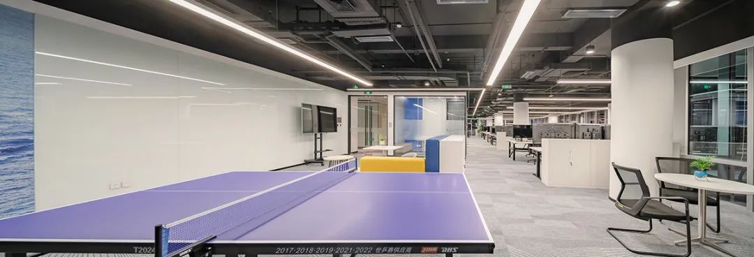 Space planning breaks the traditional grid constraints and connects the front desk, office area, public collaboration area, and leisure area with a "mobile layout". The blue gradient glass curtain wall in the front desk area creates a visual impact with the gray stone floor, highlighting the technological attributes of the enterprise; The office area adopts adjustable workstations, matched with customized cable trays and storage systems, to meet the personalized work habits of employees. The rest area is specially equipped with a table tennis table and a green plant wall, which concretizes the concept of "work life balance", while the open pantry becomes an informal social hub for cross departmental communication.