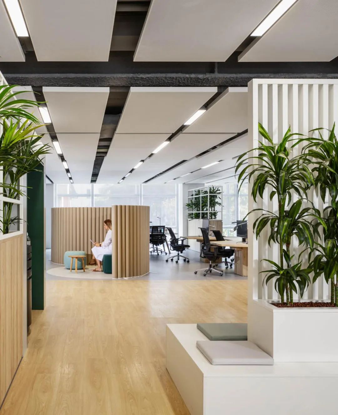 The spatial layout is based on the principle of "flexibility and diversity", constructing a "social+work" composite scene, divided into three functional areas: collaborative social area (intelligent conference system supports multi scene switching), dedicated work area (sound insulation design creates a peaceful atmosphere), and community open area (green plant walls and flexible seats open to the community). Employees can choose their own work scenarios and enhance the "people-oriented" experience.