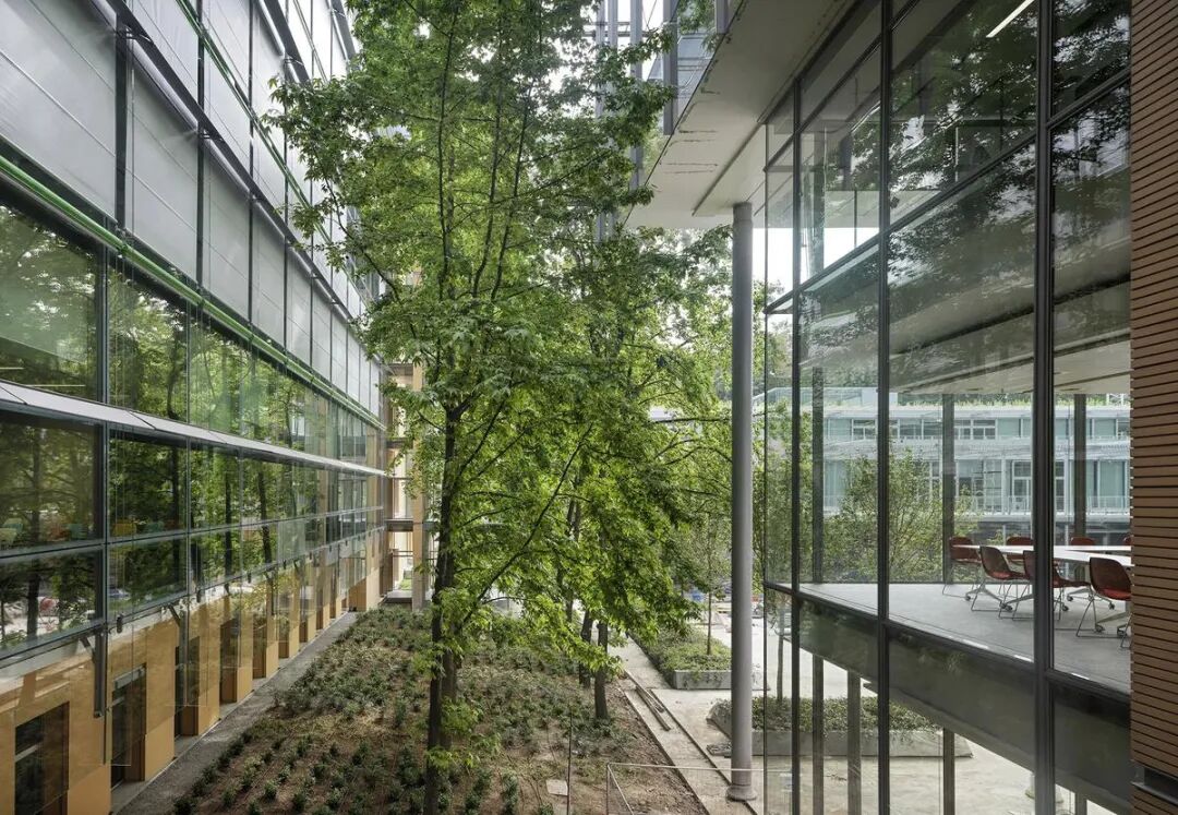 建筑获WiredScore白金认证与Leed Core&Shell白金认证,计划冲击Leed v4 Ebom认证。采用FSC认证木材、再生金属与低VOC涂料,智能照明与空调系统降低能耗30%,亲生物设计改善空气质量,办公家具与环保理念呼应品牌“以人为本”使命。